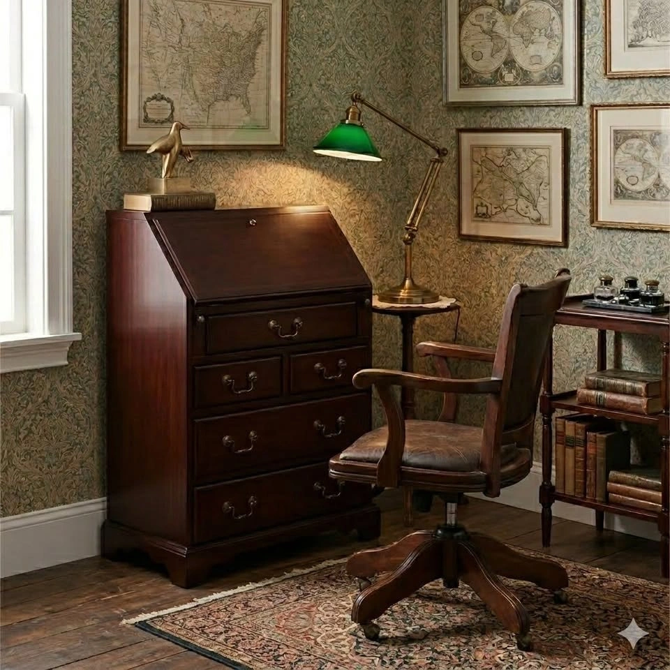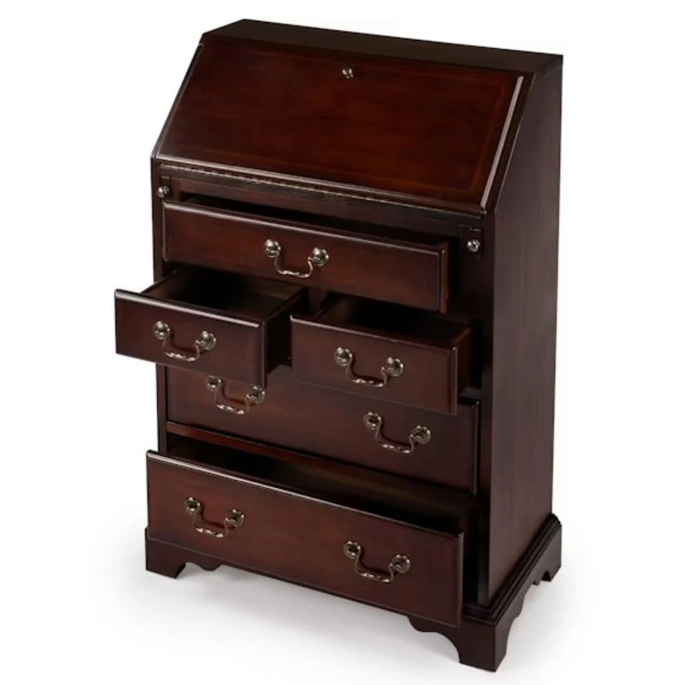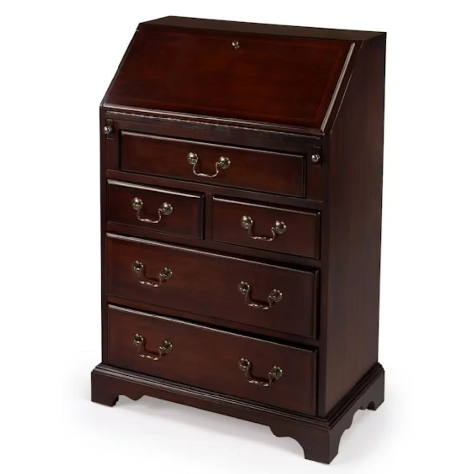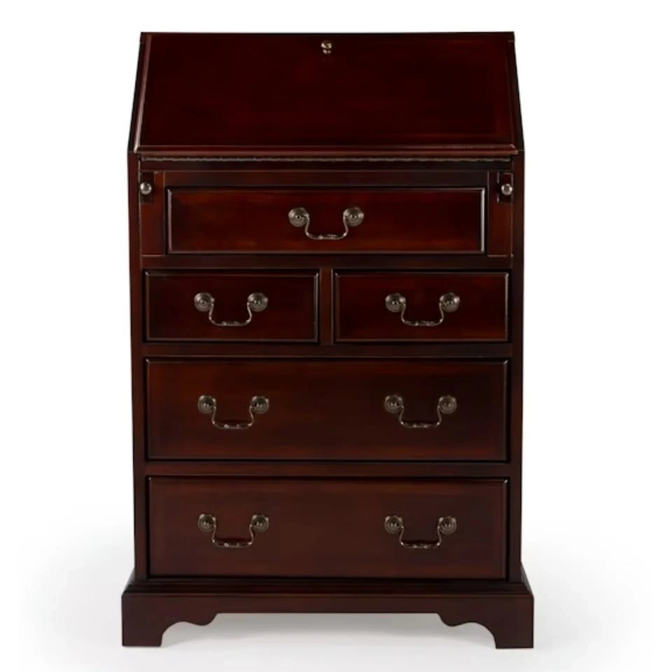 A perfect desk for writing emails, paying bills, or dramatically opening the drop-front like you're about to sign something important in the 1800s. This classic secretary desk looks small, but it’s basically the Swiss Army knife of furniture — drawers, hidden drawers, cubbies, and more drawers for things you’ll definitely forget you put there. Great for small spaces, apartments, bedrooms, or anyone trying to look more organized than they actually are. Close the desk and the mess disappears. Open it and suddenly you’re productive! Features: Drop-front writing surface, Hidden interior drawers and cubbies, Five exterior drawers, Solid wood and wood veneers, Classic traditional styling, Fully assembled, Compact footprint, lots of storage. Dimensions: 25.5"W x 14"D x 38"H.