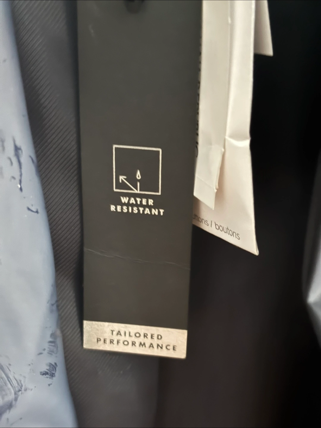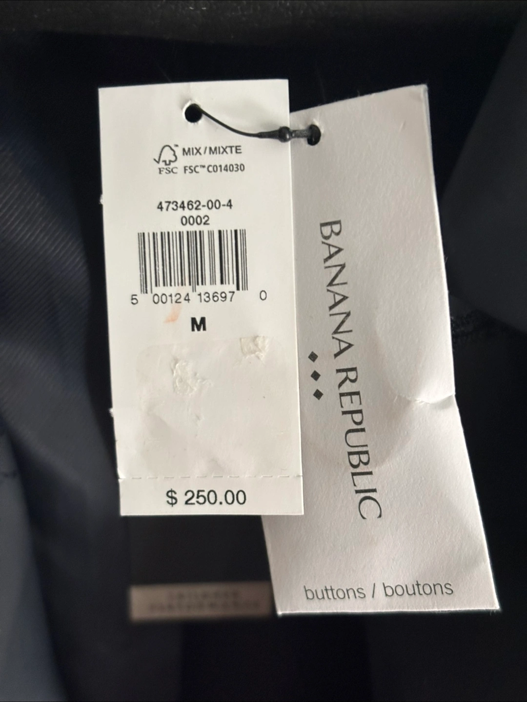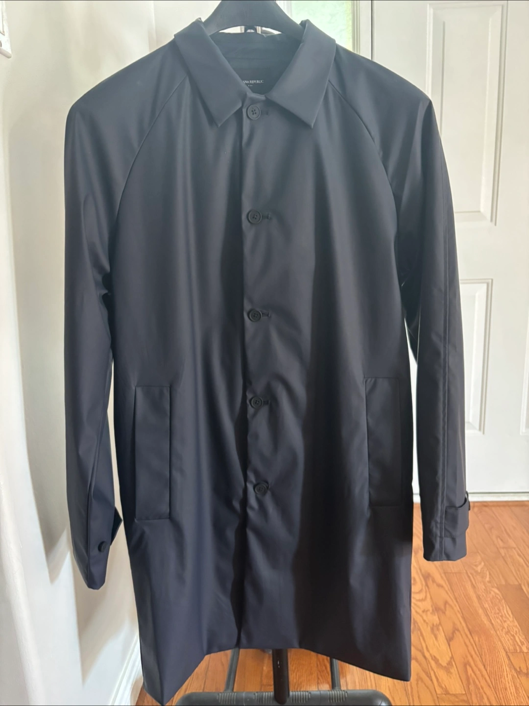 Selling a Banana Republic Tailored Performance raincoat in size M. It's a stylish and practical piece, perfect for those rainy days! The tag shows it's water-resistant and was originally bought for $250