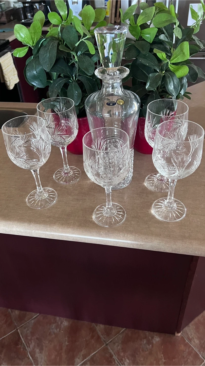 Elegant crystal decanter and 5 wine glasses. Features intricate starburst cut patterns. Adds a touch of sparkle to any bar or dining setting!