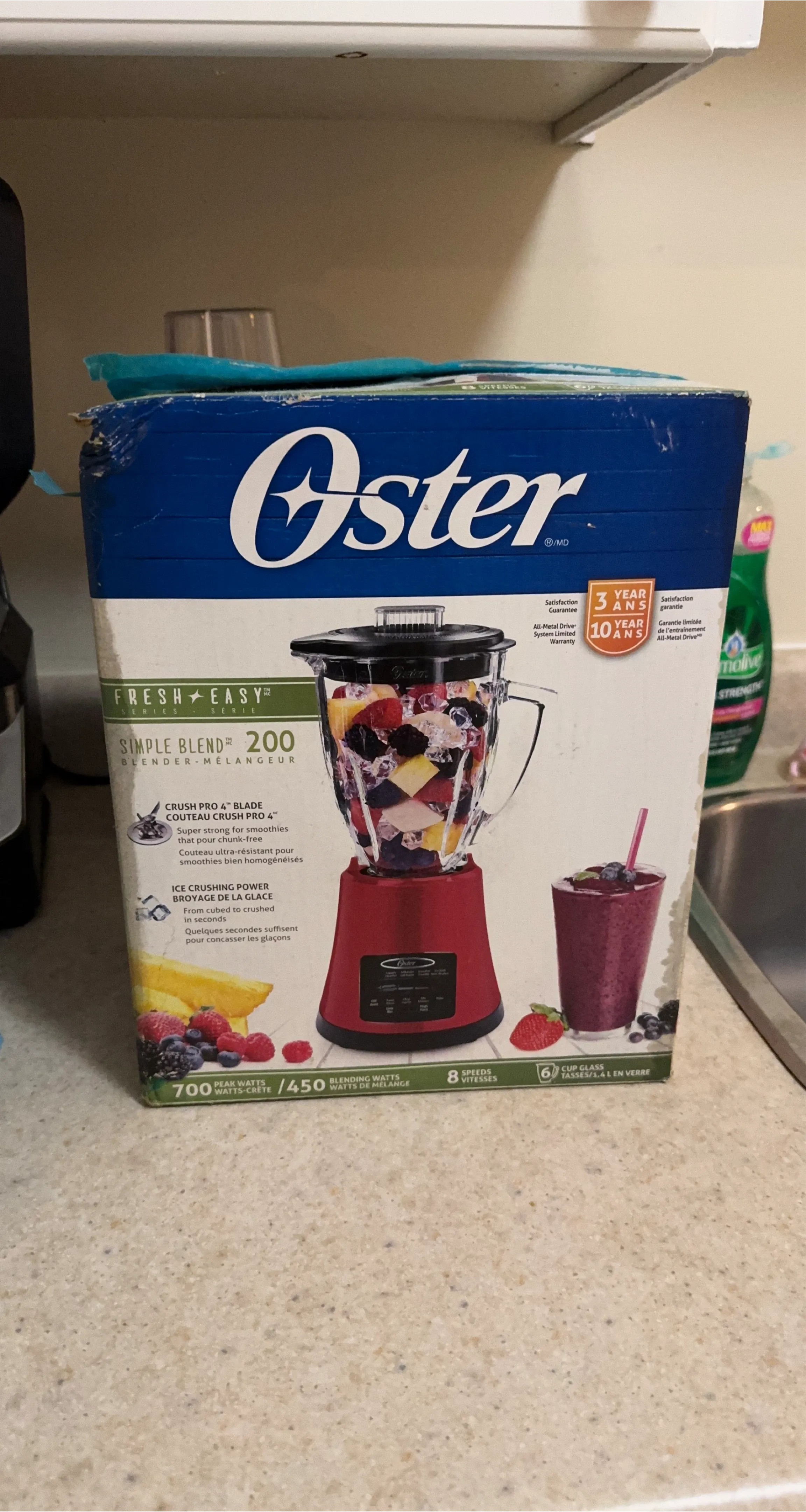 Oster Simple Blend 200 blender with a red base. It has 700 peak watts and 450 blending watts with 8 speeds. Features a Crush Pro 4 blade and a 1.4 L glass jar. Includes a 3-year satisfaction guarantee and a 10-year All-Metal Drive System Limited Warranty.
