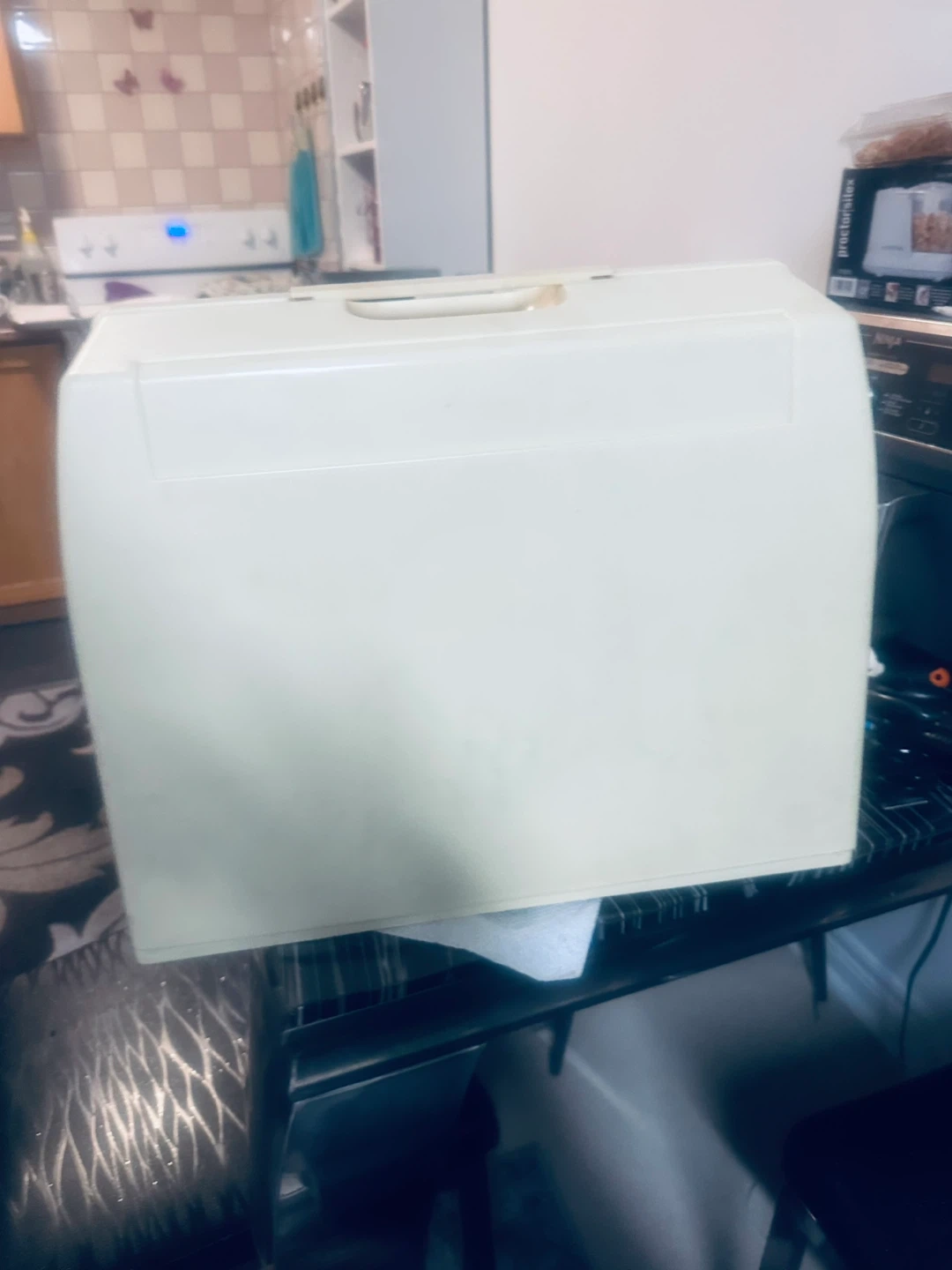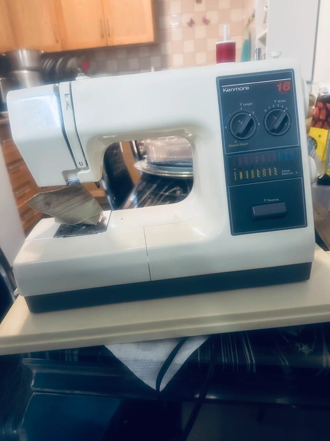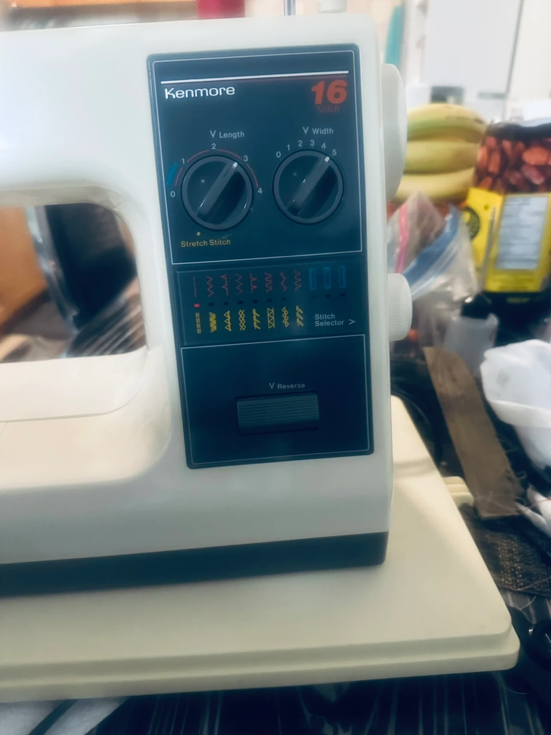 This is a Kenmore sewing machine with 16 stitch options. It includes controls for stretch stitch length and width. It also comes with a protective case.