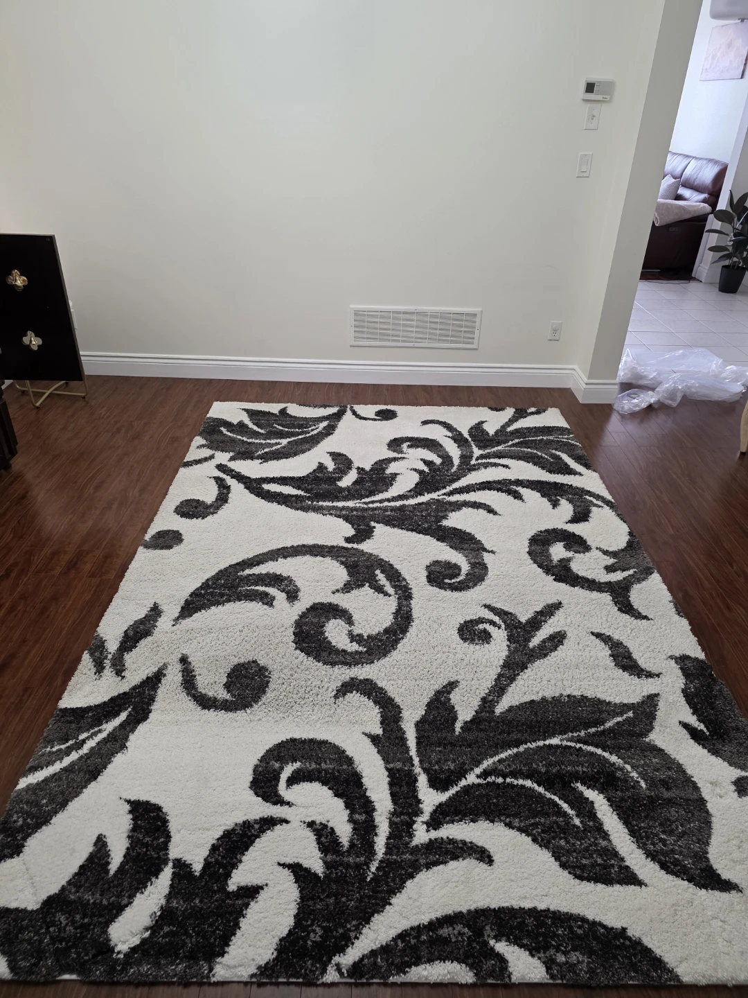 This large area rug features a bold black and white damask pattern. It's soft and shaggy, adding comfort and style to any room. Adds a modern touch to your living space!