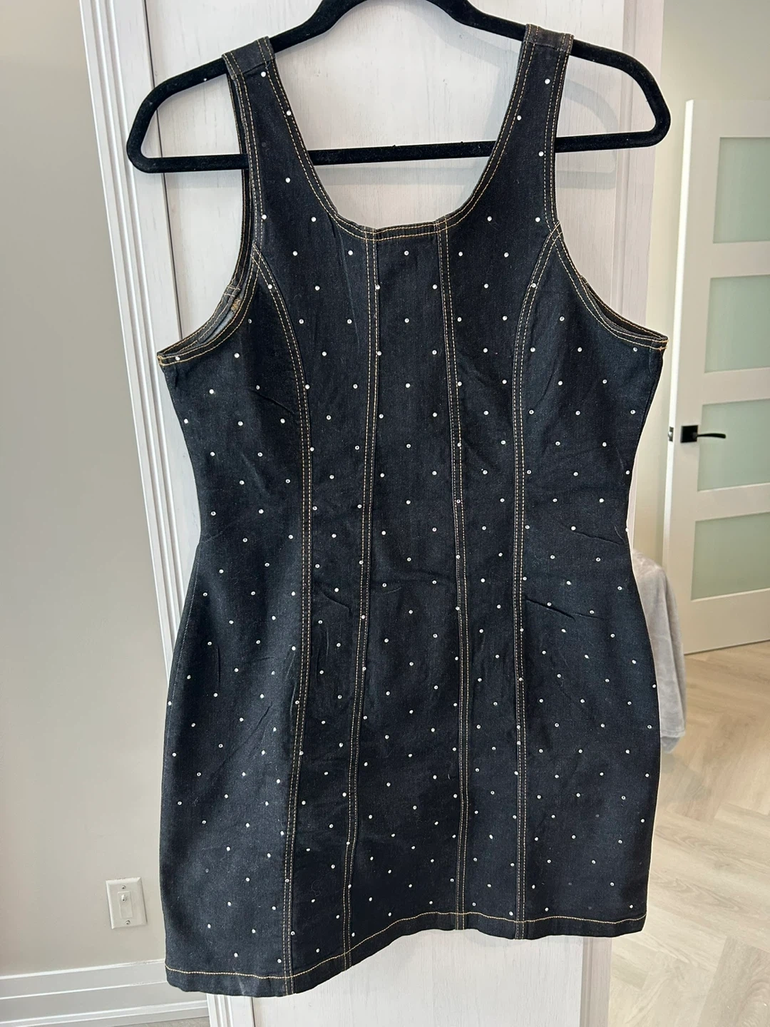 This dark wash denim dress has a zip-up front and is adorned with all-over rhinestones. It's a sleeveless design with contrast gold stitching throughout. Looks great for a night out!