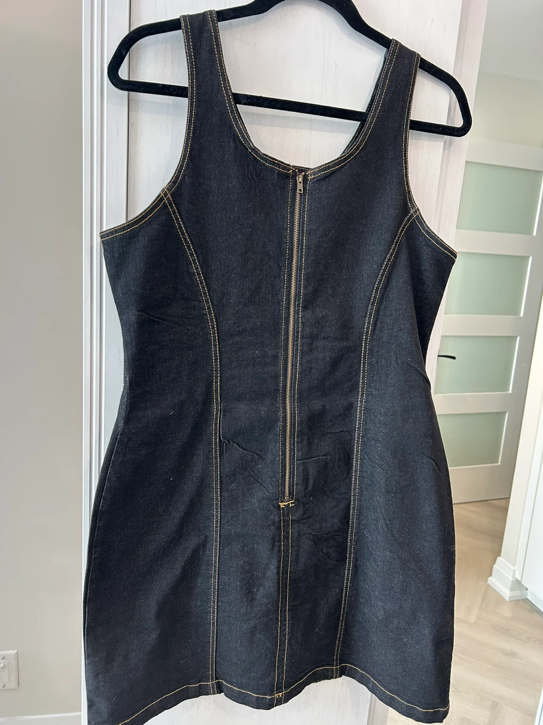 This dark wash denim dress has a zip-up front and is adorned with all-over rhinestones. It's a sleeveless design with contrast gold stitching throughout. Looks great for a night out!