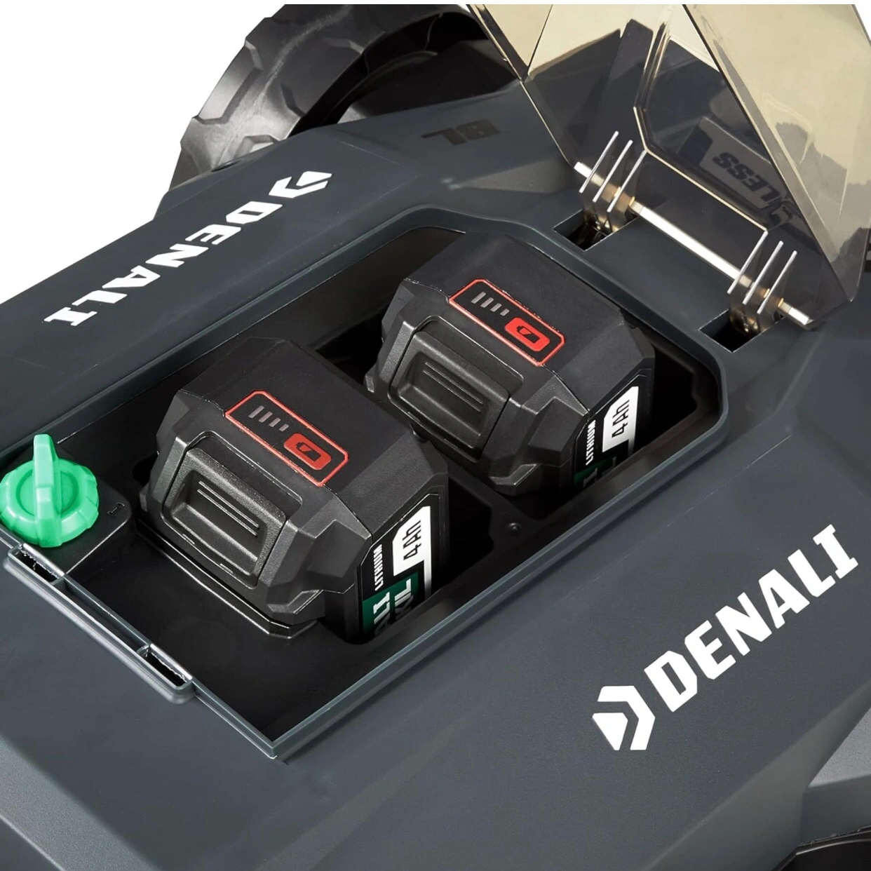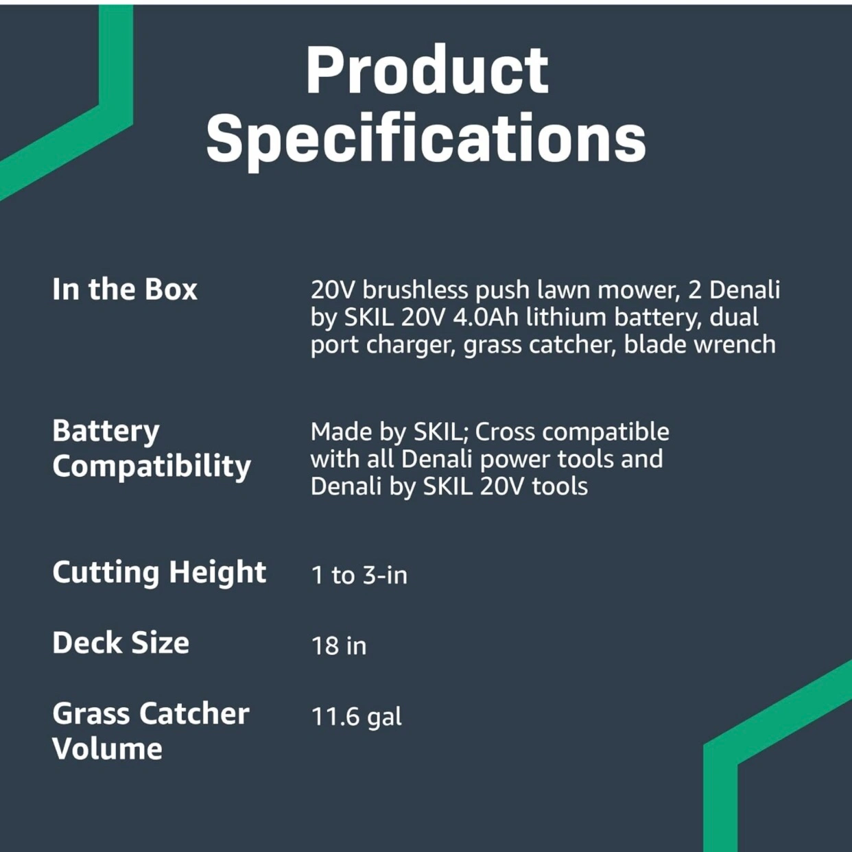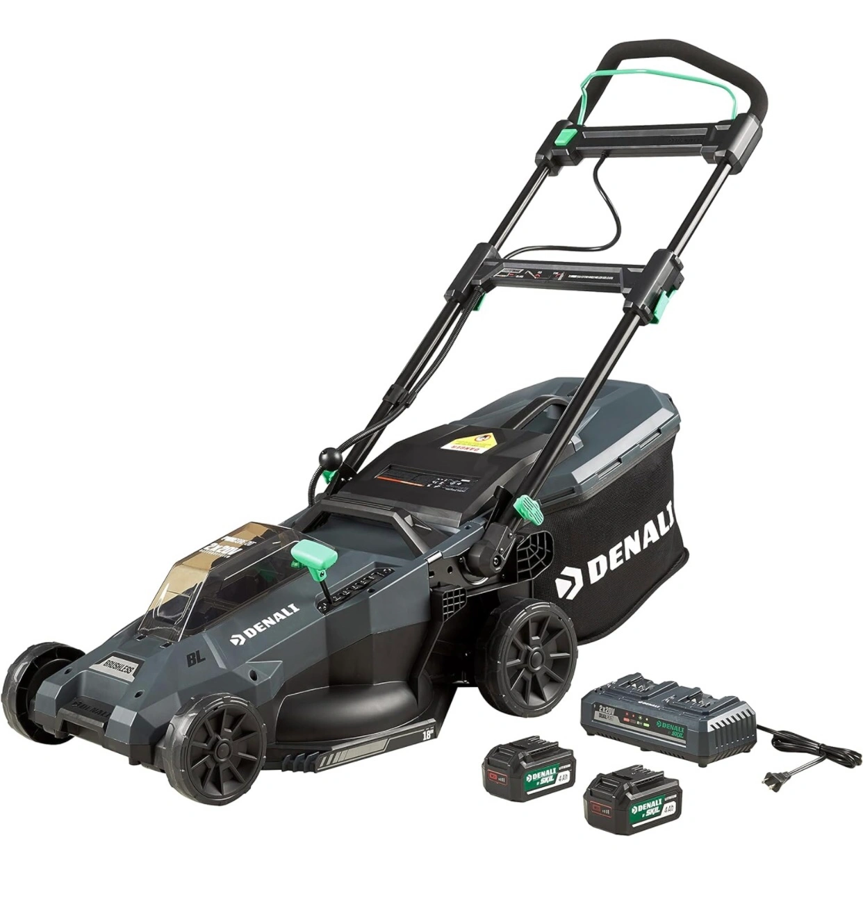 Includes a 20V 18-inch cordless lawn mower with polymer deck, (2) 4.0Ah lithium-ion batteries, and a dual port charger; Lawn Mower runs on (2) Denali by SKIL Lithium-Ion batteries