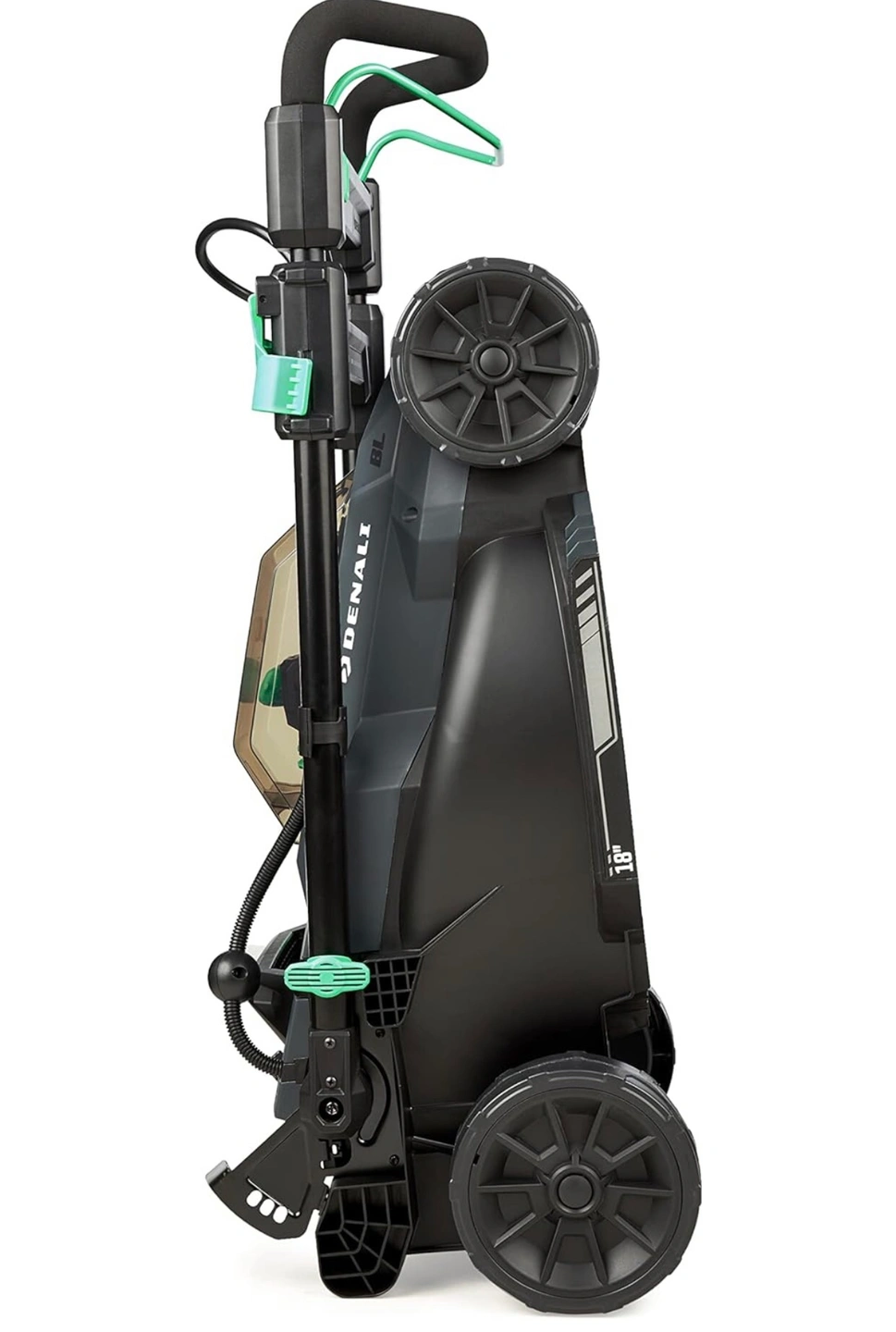 Telescoping, foldable handle allows for storing the lawn mower vertically to save space