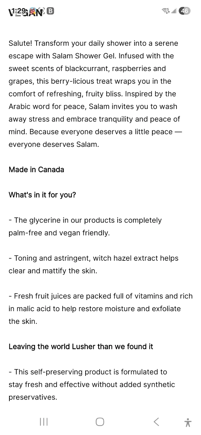 This LUSH SALAM shower gel is a limited edition. It's infused with blackcurrant, raspberries, and grapes for a refreshing scent. The formula is palm-free, vegan-friendly, and made in Canada.