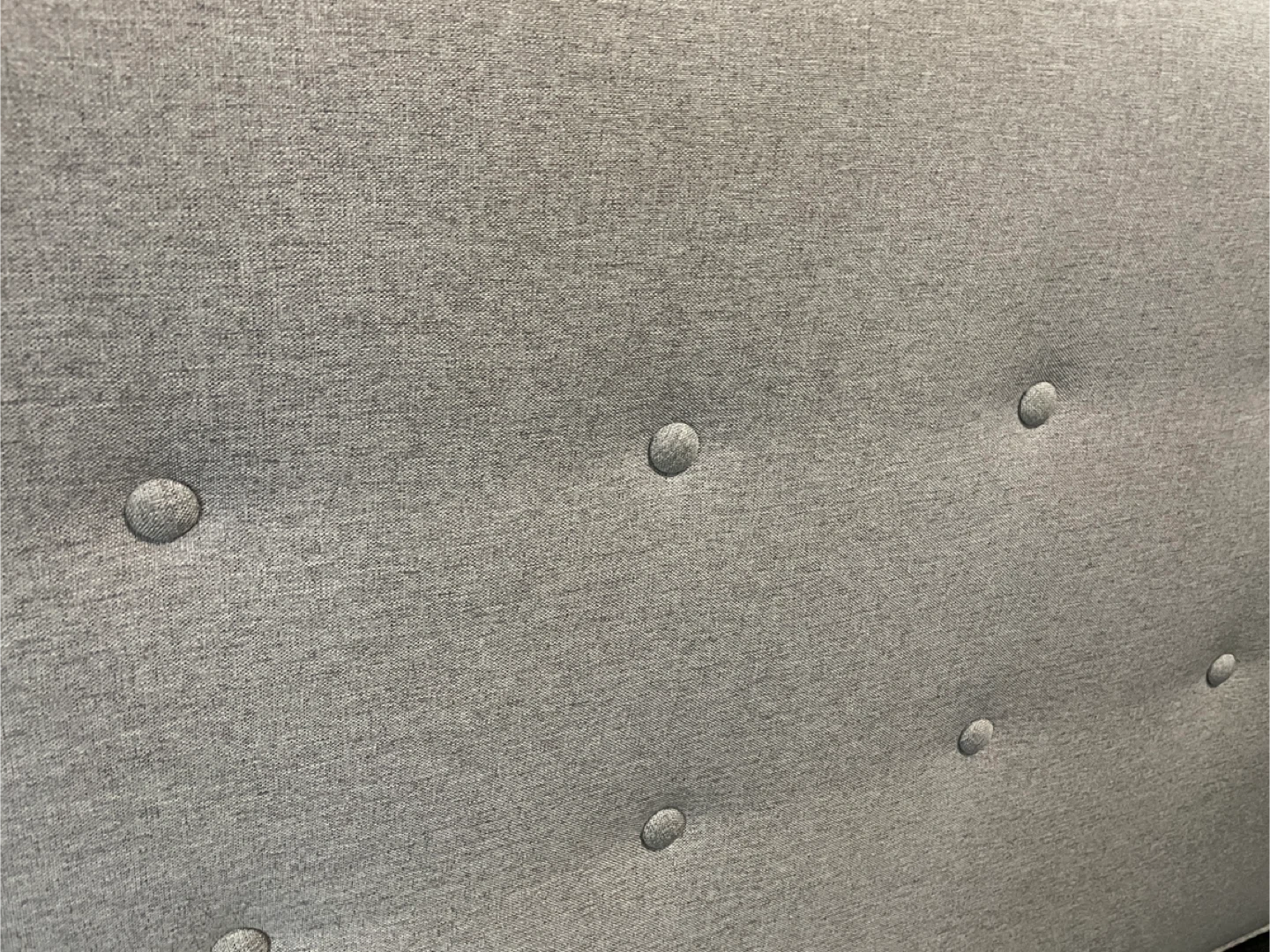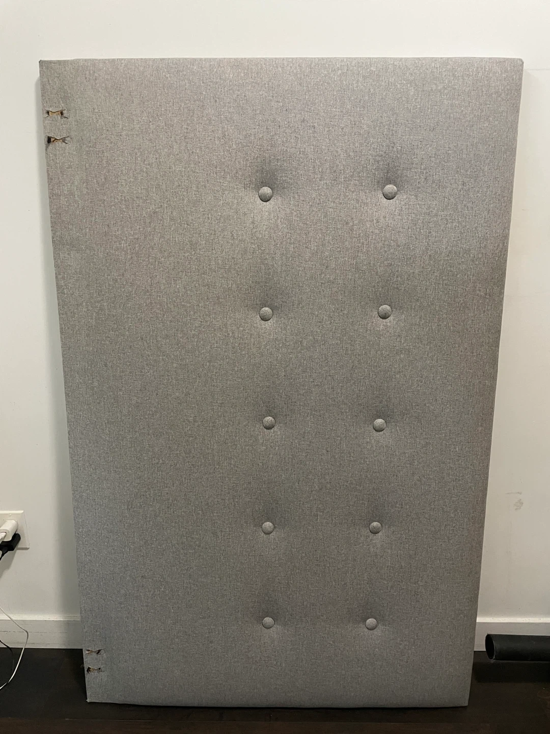 Grey tufted upholstered headboard and bed frame. Features a sturdy construction with button tufting on the headboard. Comes with a solid base for mattress support. Both are in very good condition