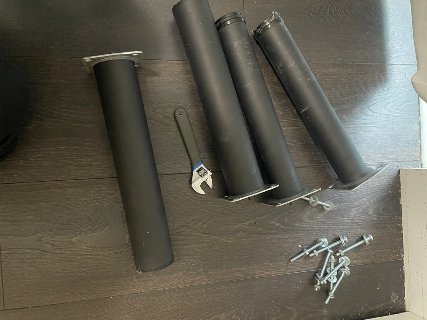 Some assembly required for the legs and headboard. I had to detach the legs and headboard so that it can be moved. Please note that you will need transportation to pick this up. Also need to give me some notice to book the elevator to bring this down.