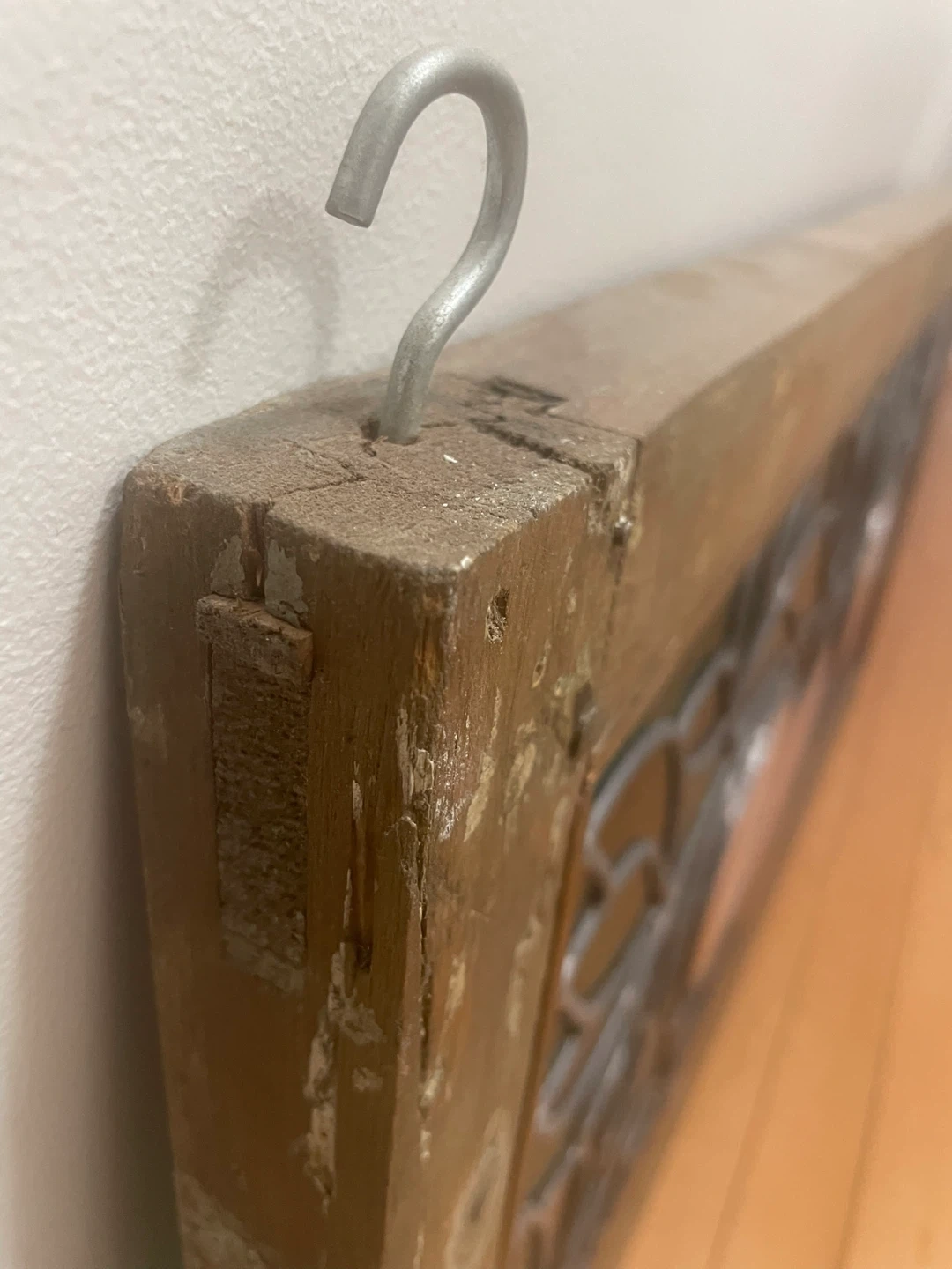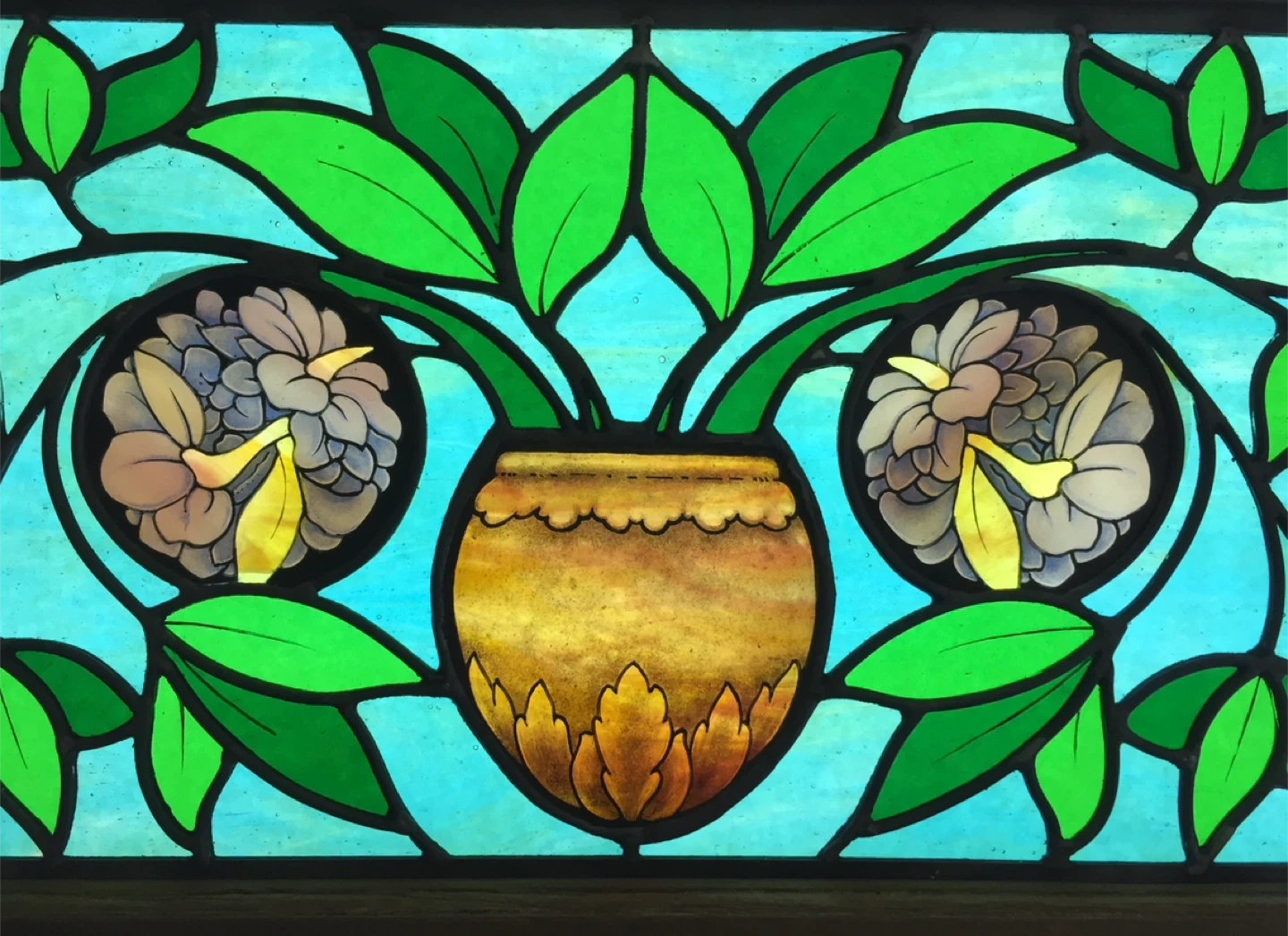This decorative stained glass panel features a floral motif with a vase of flowers in the centre. The glass has a beautiful mix of green, blue, and amber hues. It's framed in wood and has 2 hooks for hanging. 3 pieces of glass back plated to enrich the colours.