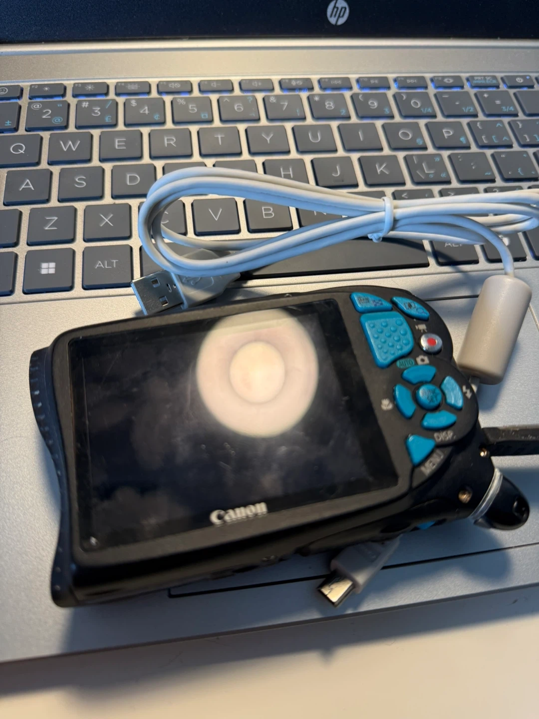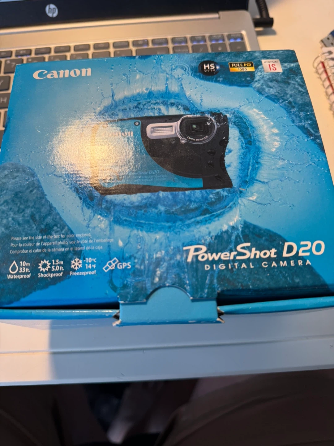 Canon PowerShot D20 digital camera in blue. It's waterproof up to 10m, shockproof, and freezeproof. Includes original box and USB cable.
