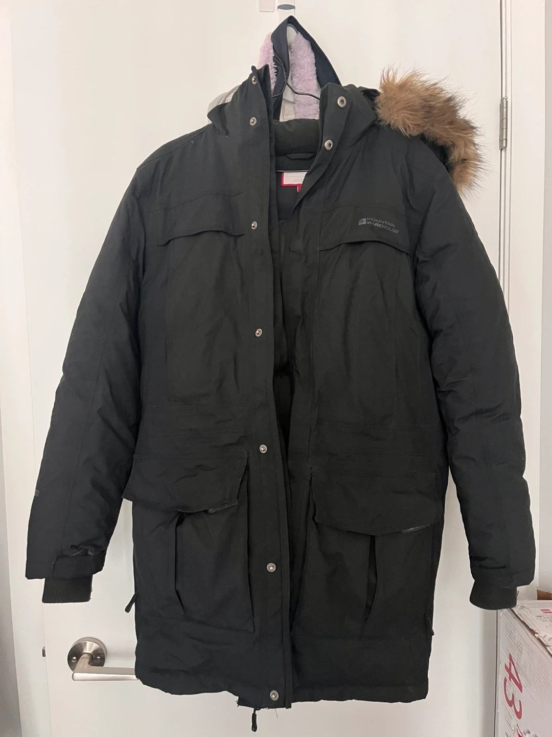 This Mountain Warehouse Extreme parka jacket is black and designed for warmth. It's a size XS