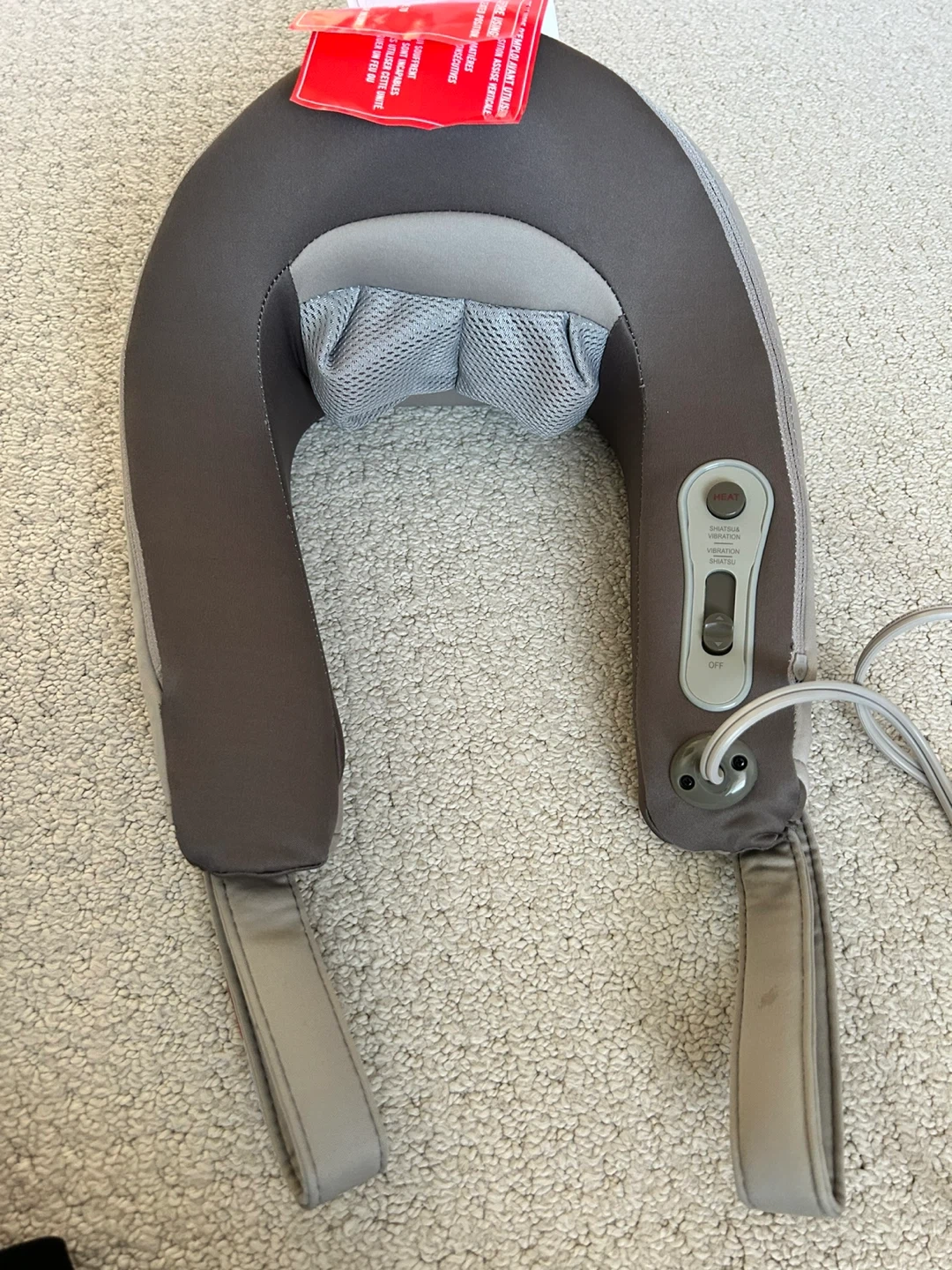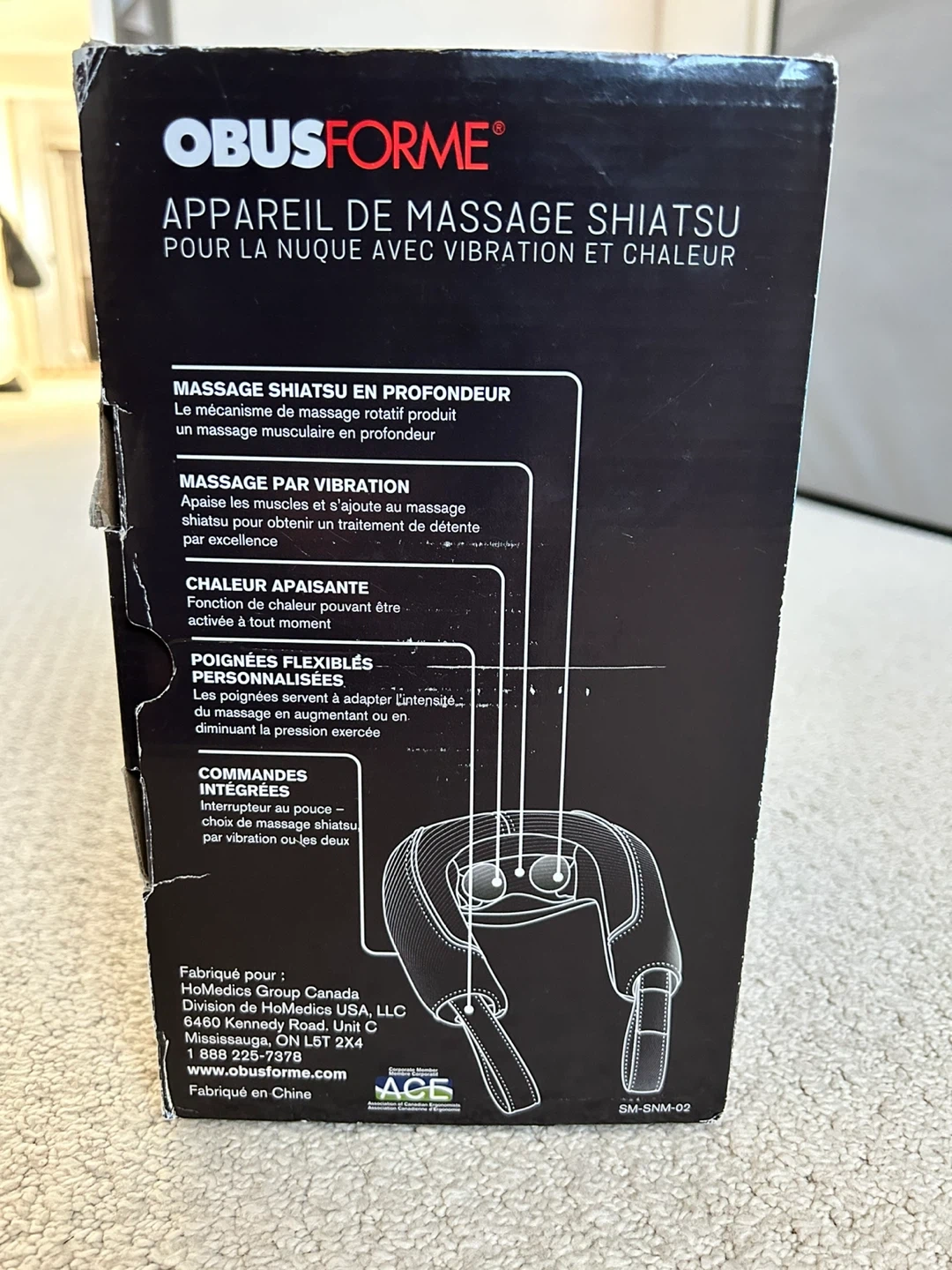 This Obusforme neck massager features a rotating shiatsu massage mechanism for deep kneading. It has integrated controls for vibration and heat, plus comfort flex handles to customize intensity. It's designed for targeted massage on the neck and shoulders.