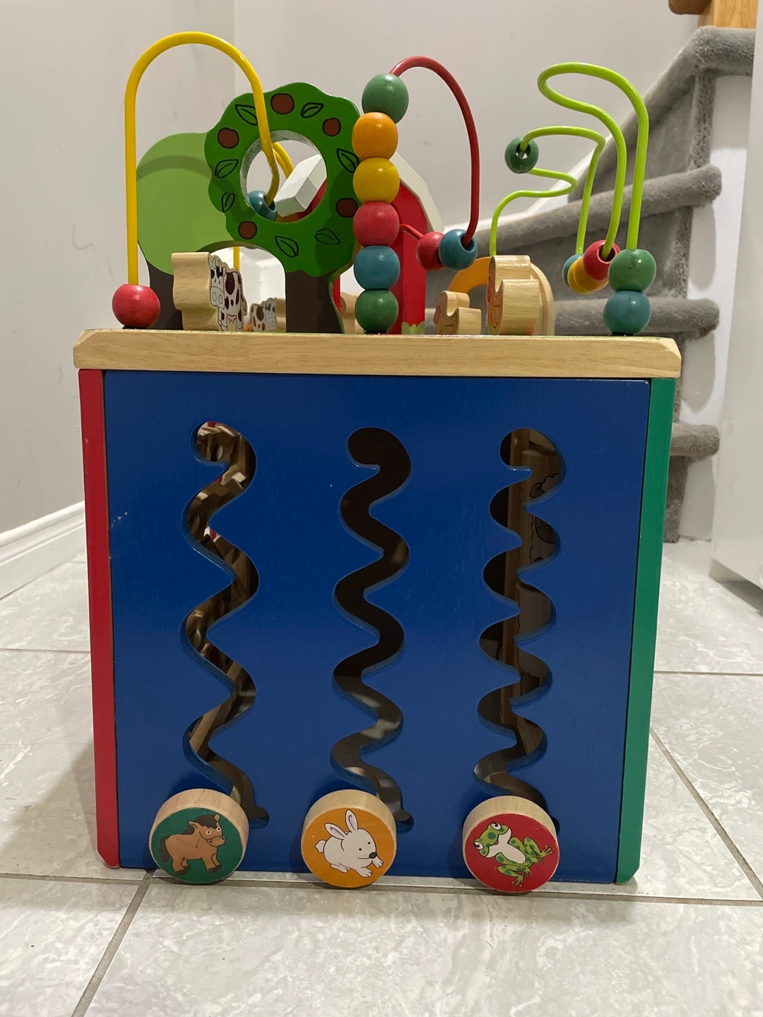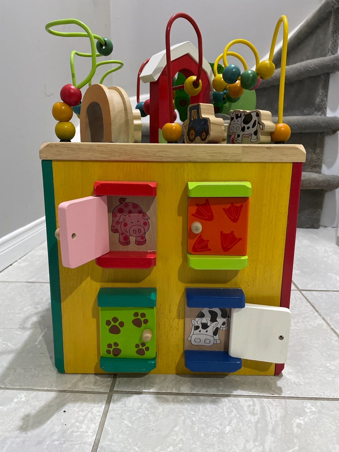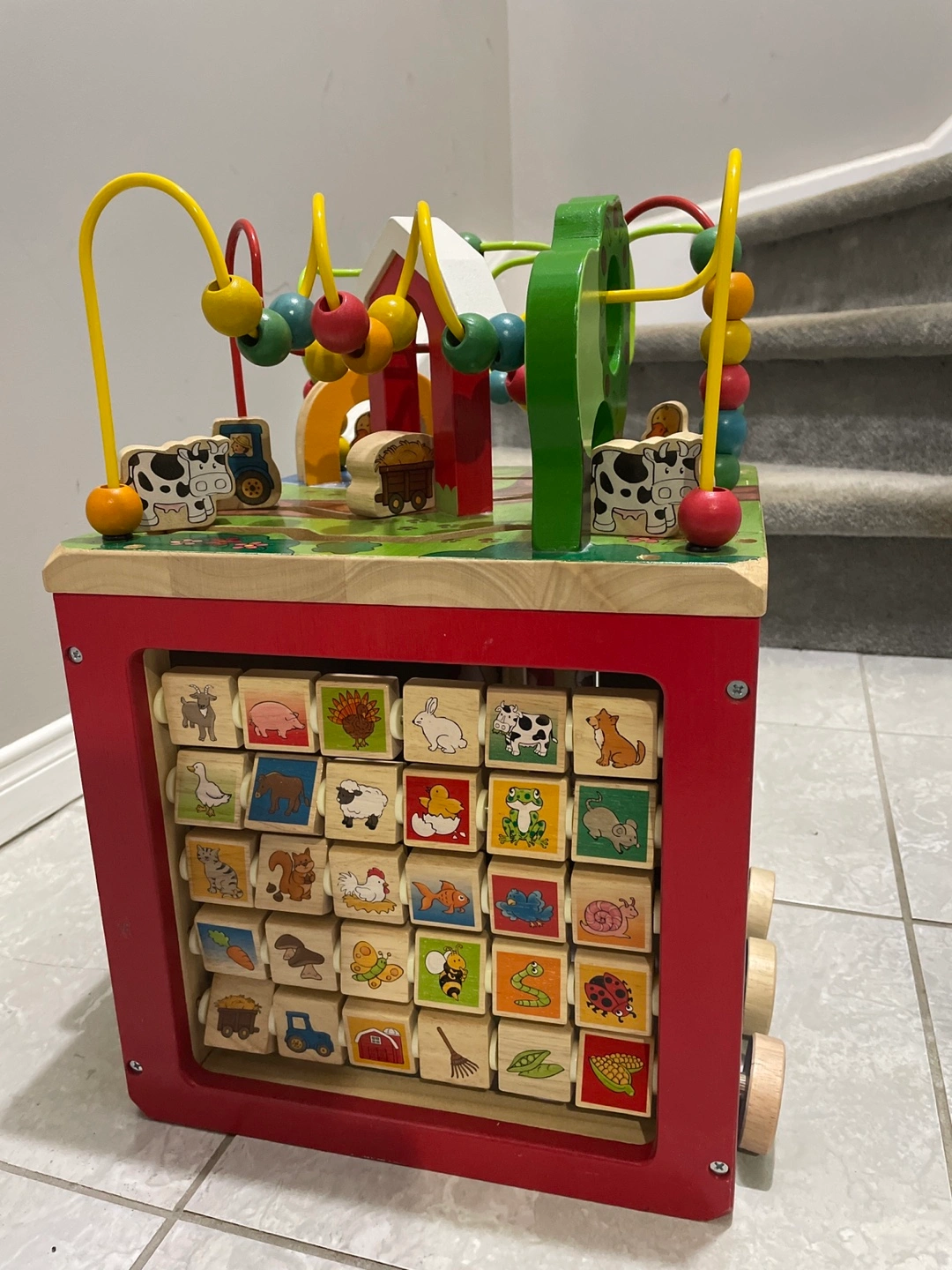 Multi-functional toy cube. Features bead maze, shape sorter, and sliding doors. Wooden blocks with farm animal pictures. Lots of activities for toddlers.