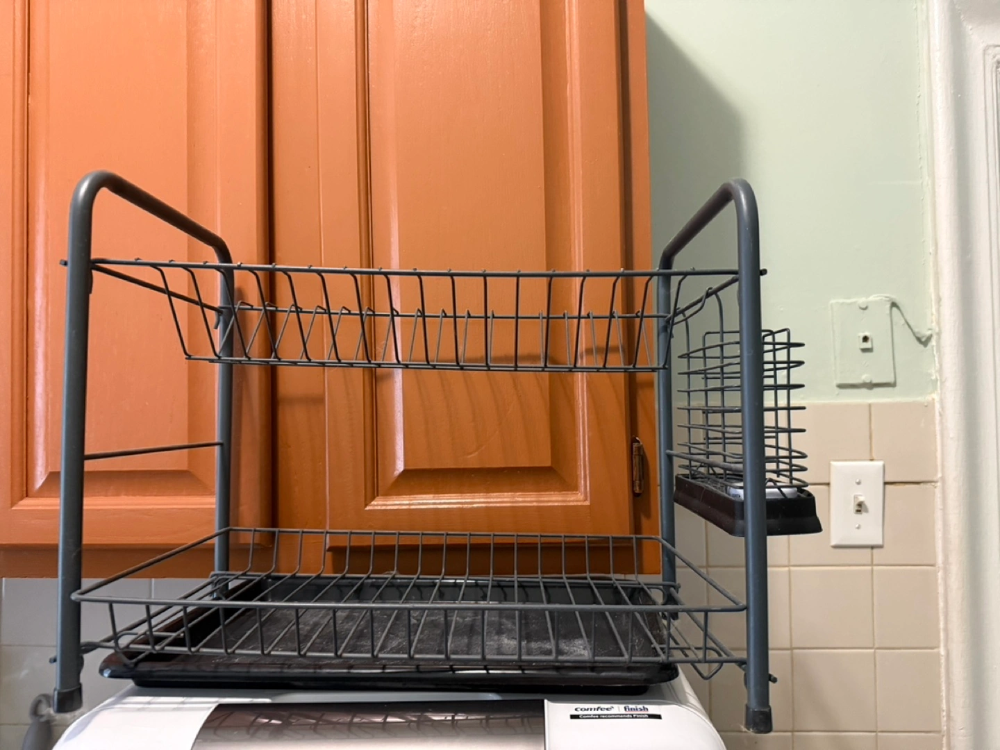 Over-the-sink dish drying rack. Two-tier design. Includes a utensil holder. Metal construction. Black finish. With tray at the bottom to keep water from leaking.