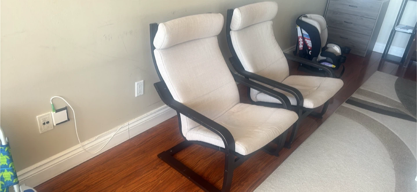 Selling two matching IKEA Poäng chairs. Light beige fabric upholstery with dark wood frame. They're comfy and stylish!