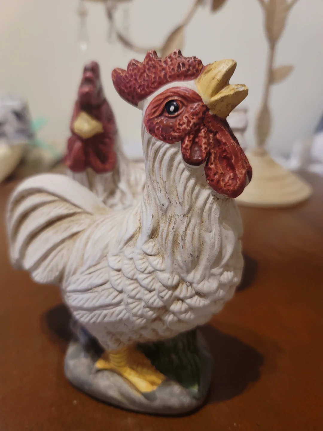 Cute ceramic roosters, perfect for adding a farmhouse touch to your décor. These figurines are great for display on a shelf or mantle.
