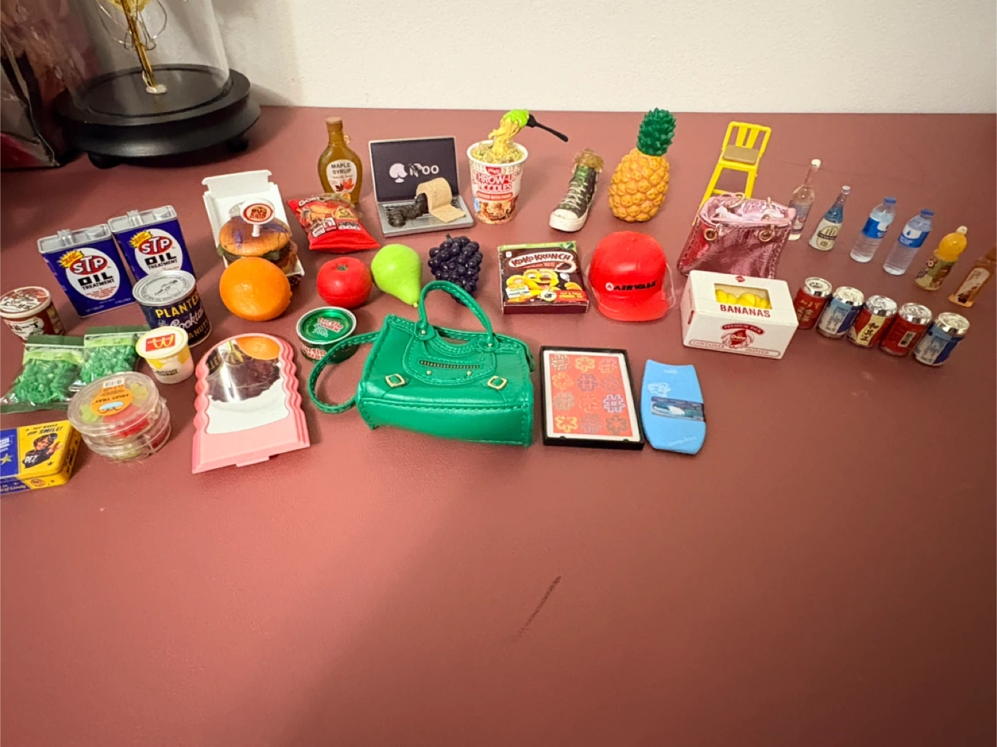 A fun collection of miniature items, perfect for dollhouses or creative displays. Includes various food items, accessories, and decor pieces.