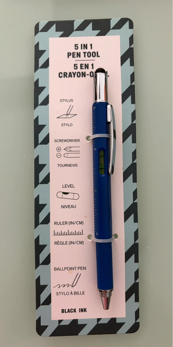 This handy 5-in-1 pen tool includes a stylus, screwdriver, level, and ruler. It writes in black ink and is great for quick fixes or on-the-go tasks. It's a handy gadget to have in your toolkit!