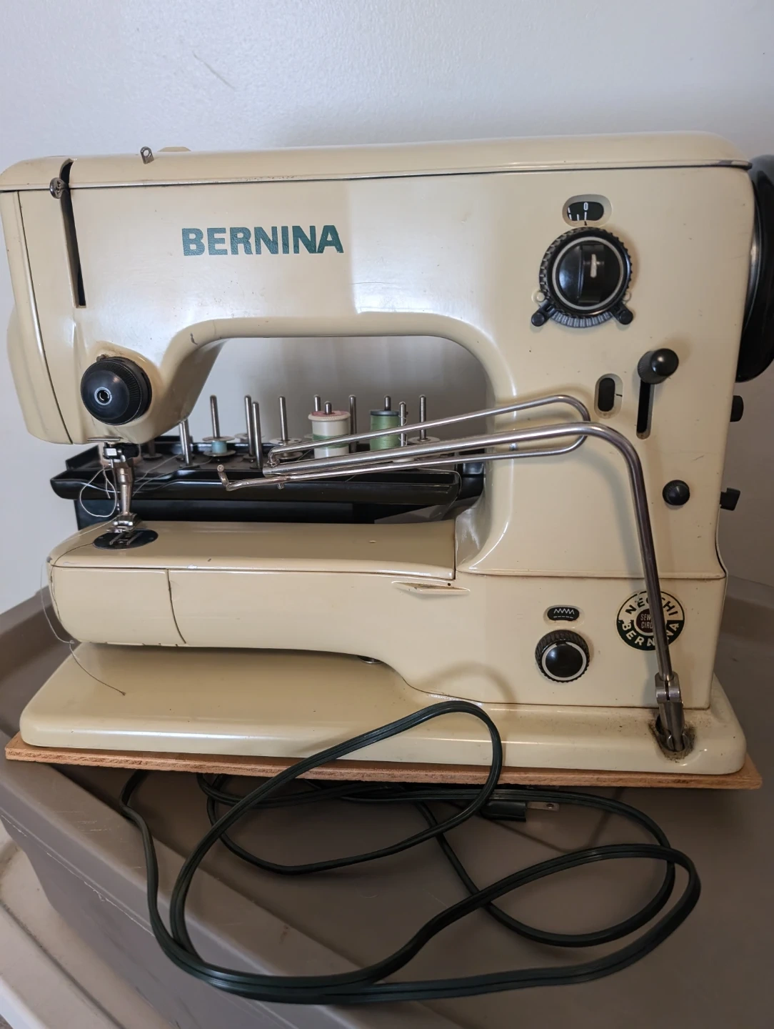 This is a vintage Bernina 532 sewing machine, complete with multiple thread spools. It's a sturdy and reliable machine for all your sewing projects. It's perfect for sewers looking for a classic, durable machine.