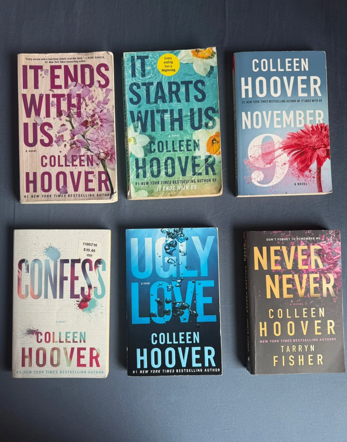 Collection of popular novels by Colleen Hoover. Includes "It Ends With Us", "It Starts With Us", "November 9", "Confess", "Ugly Love", and "Never Never". $7 each. Or all 6 for $30