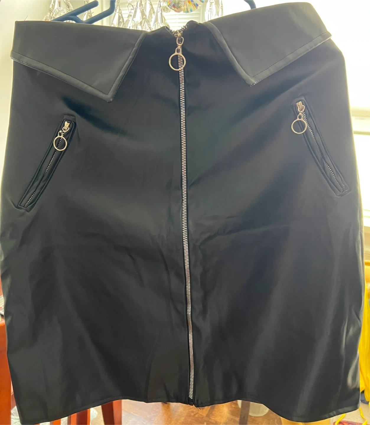 Here's a stylish black mini skirt featuring a front zipper and pocket details! It's in great condition and ready to be added to your wardrobe! Perfect for a night out or a trendy daytime look