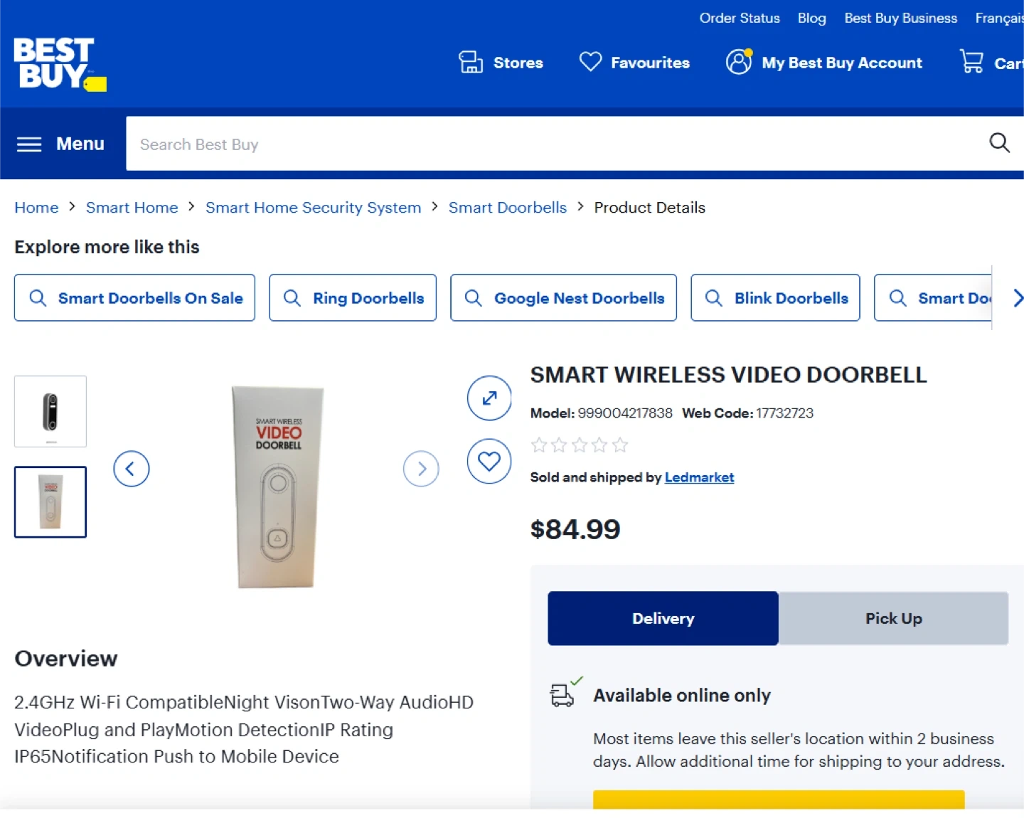 Selling a smart wireless video doorbell. It's 2.4GHz Wi-Fi compatible and has night vision. It also features two-way audio and HD 1080p video. Originally bought for $84.99.