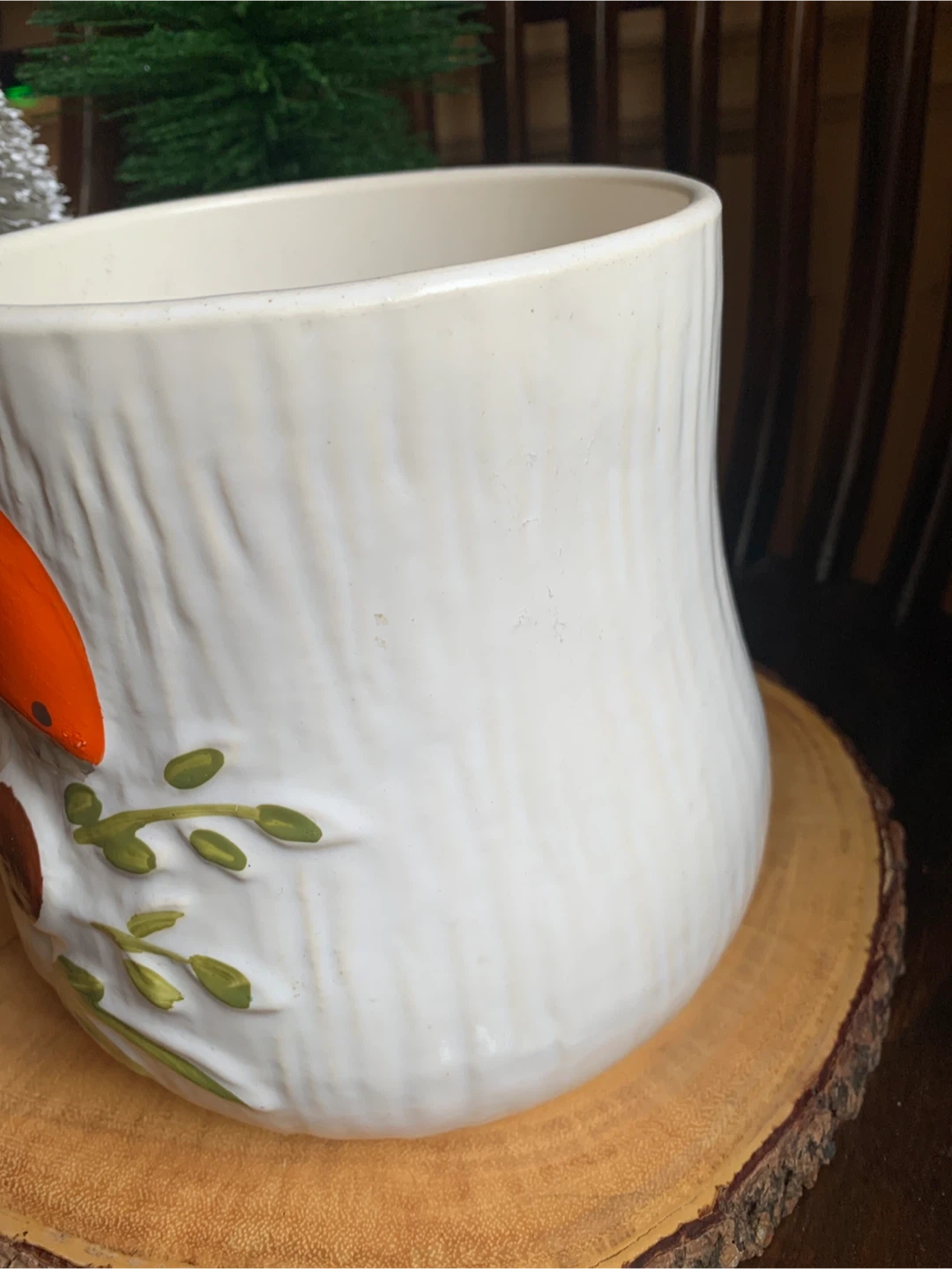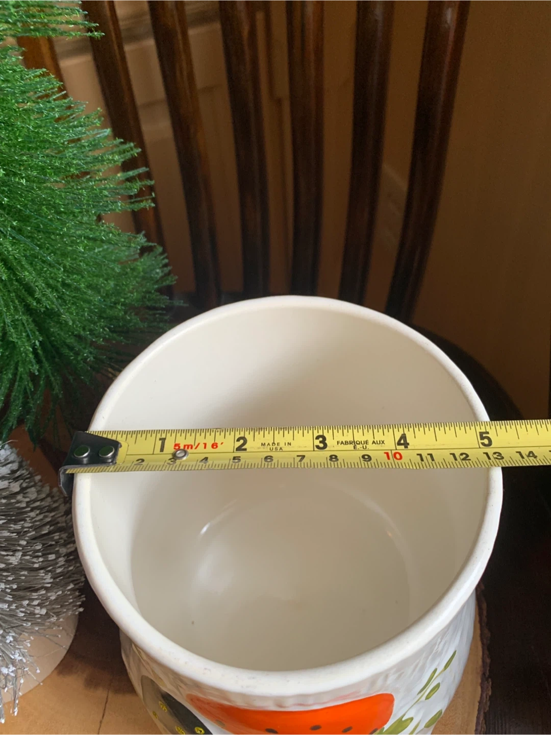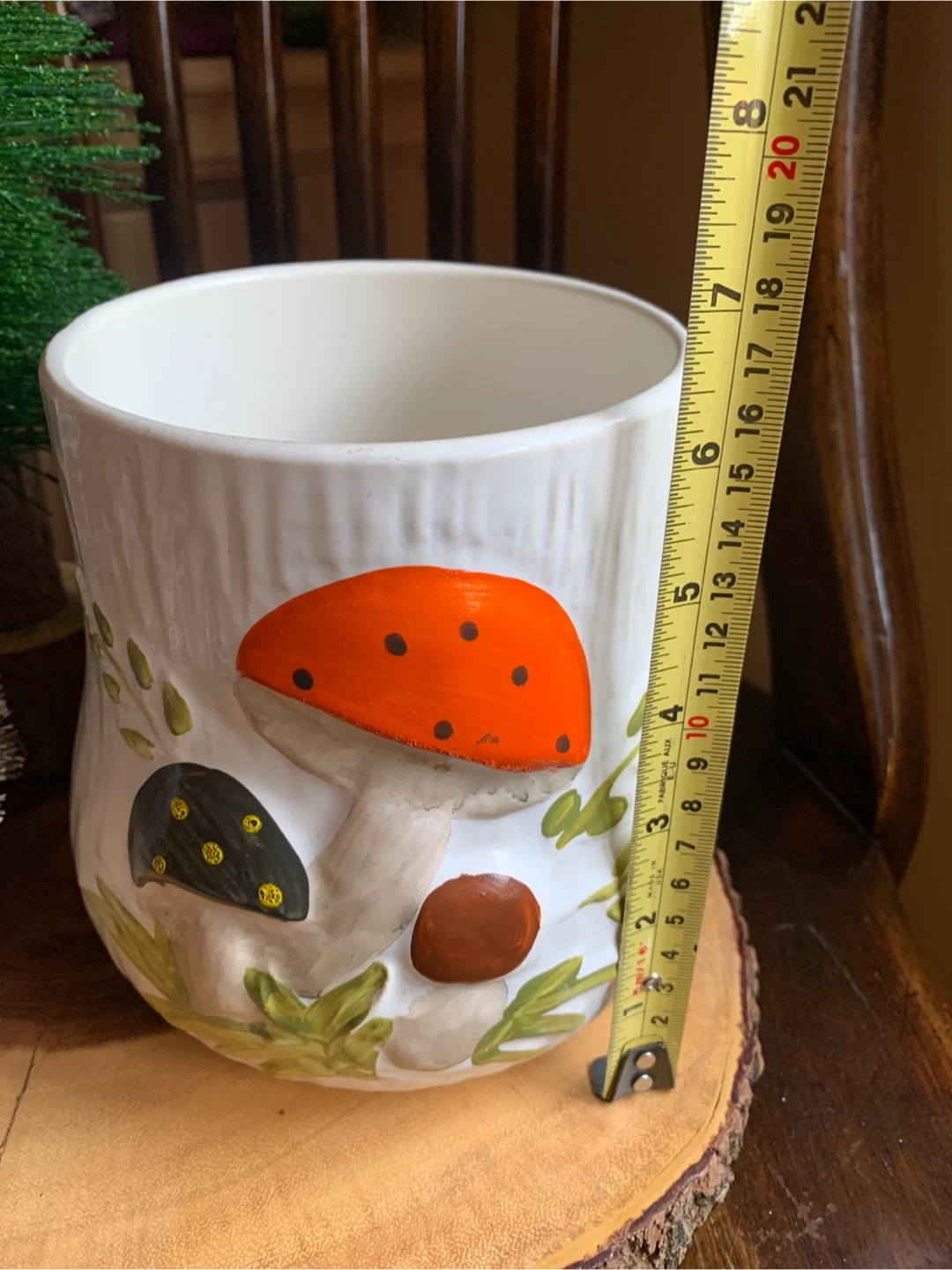 Here is a vintage 1970βs ceramic Merry Mushroom canister that has lost its lid. It was made in Canada by Sears and Roebuck and is a good quality substantial piece. It still can have a beautiful life as a kitchen utensil holder on your counter or could be transformed into a planter! It has no chips or cracks and just some normal wear on it but the mushrooms are still very vibrant! ππβπ«π