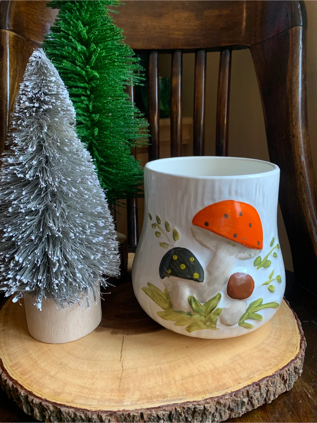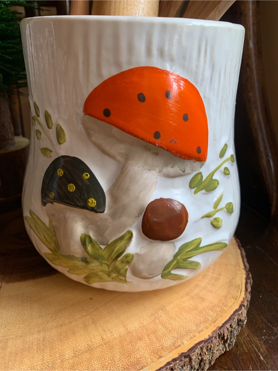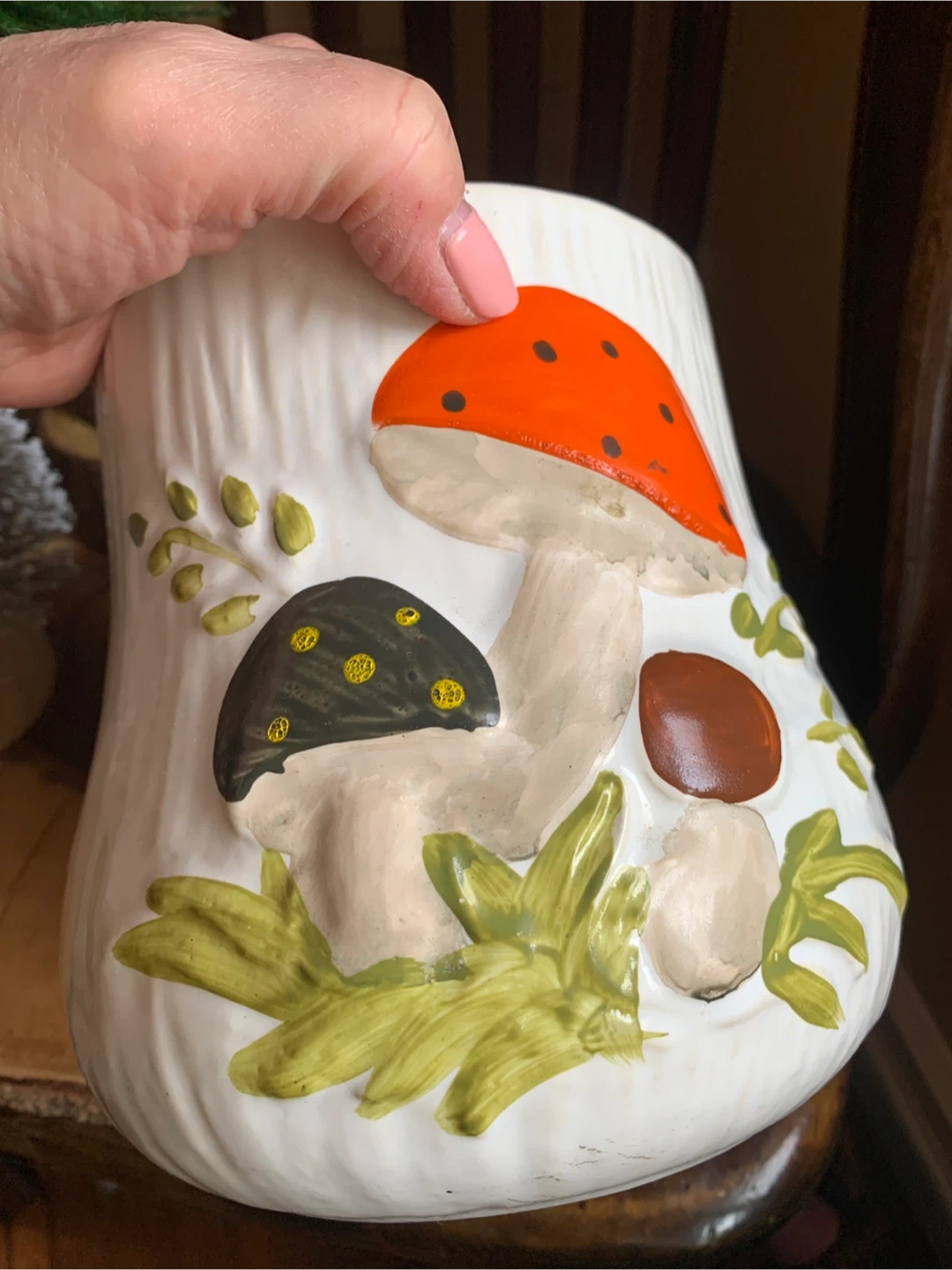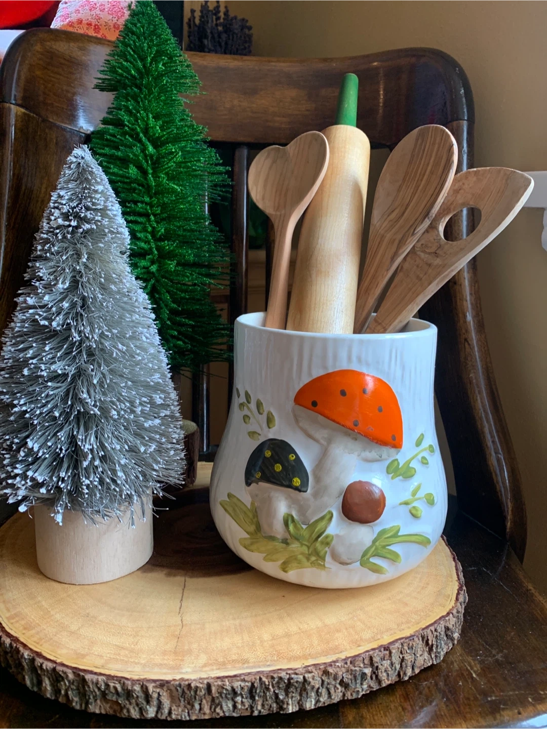 Here is a vintage 1970βs ceramic Merry Mushroom canister that has lost its lid. It was made in Canada by Sears and Roebuck and is a good quality substantial piece. It still can have a beautiful life as a kitchen utensil holder on your counter or could be transformed into a planter! It has no chips or cracks and just some normal wear on it but the mushrooms are still very vibrant! ππβπ«π