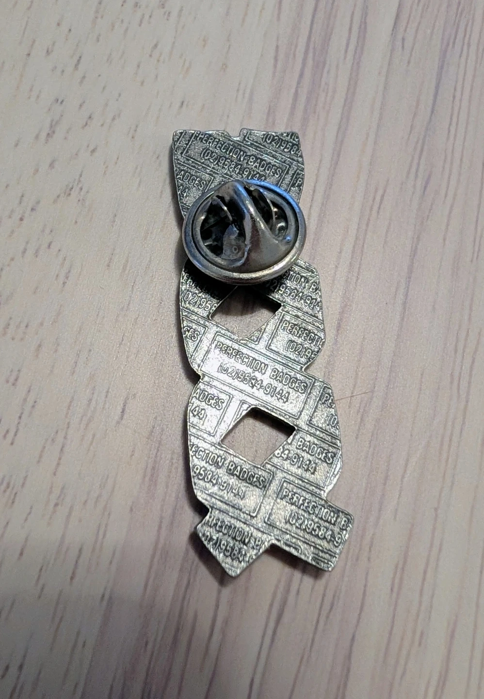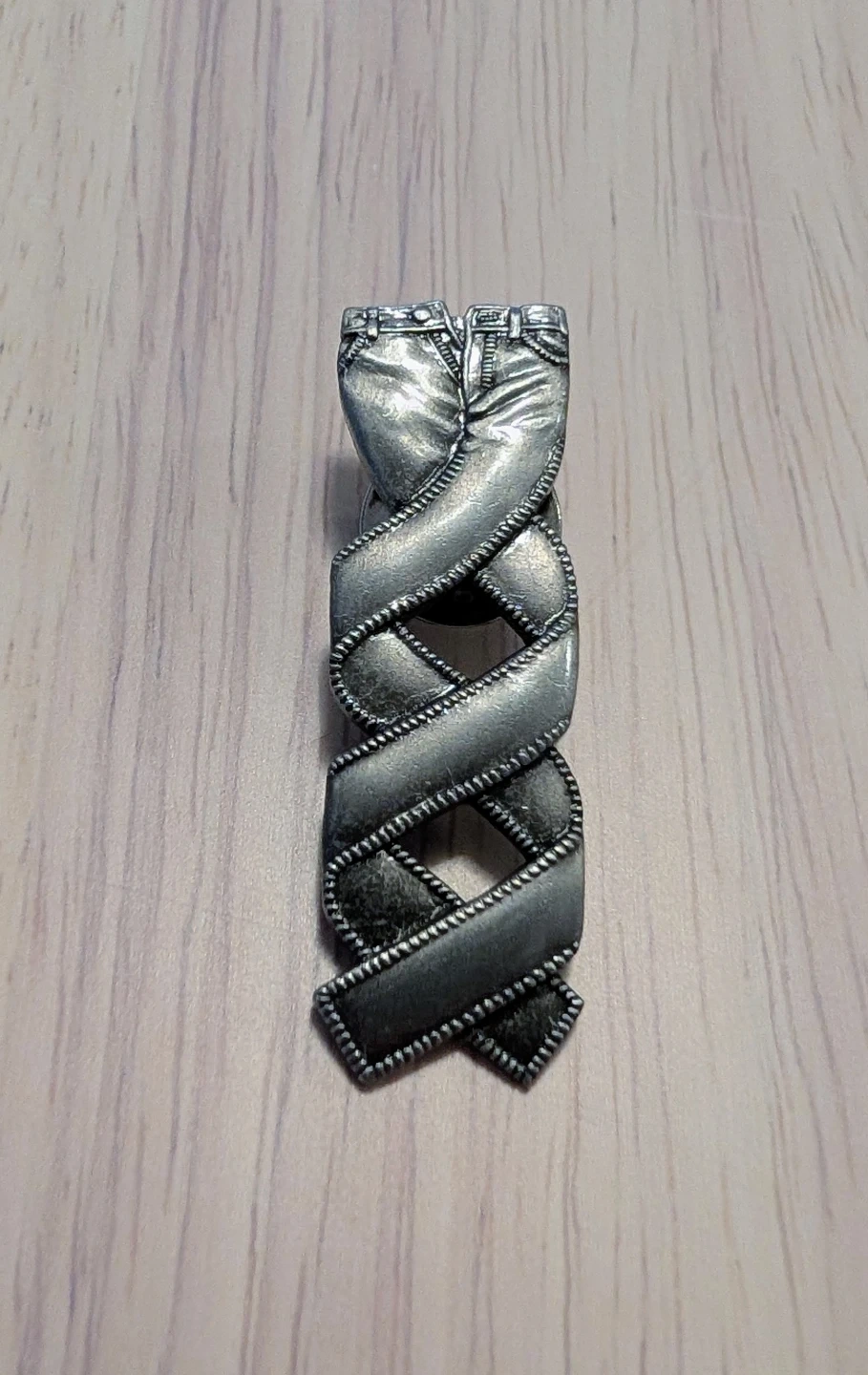 This pin features a silver design of jeans twisted into a DNA helix shape. It's made from metal with a secure pin backing. A unique accessory for any denim enthusiast!