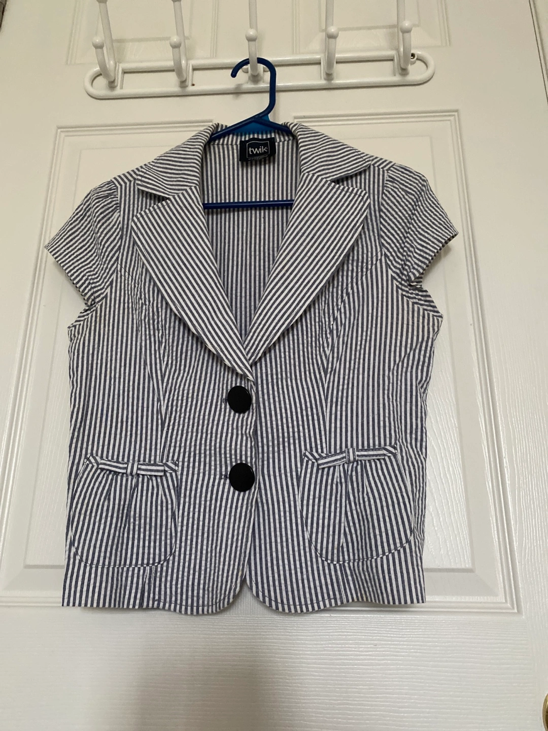 Cute striped short sleeve blazer from Twik! It features a two-button closure and adorable little pockets