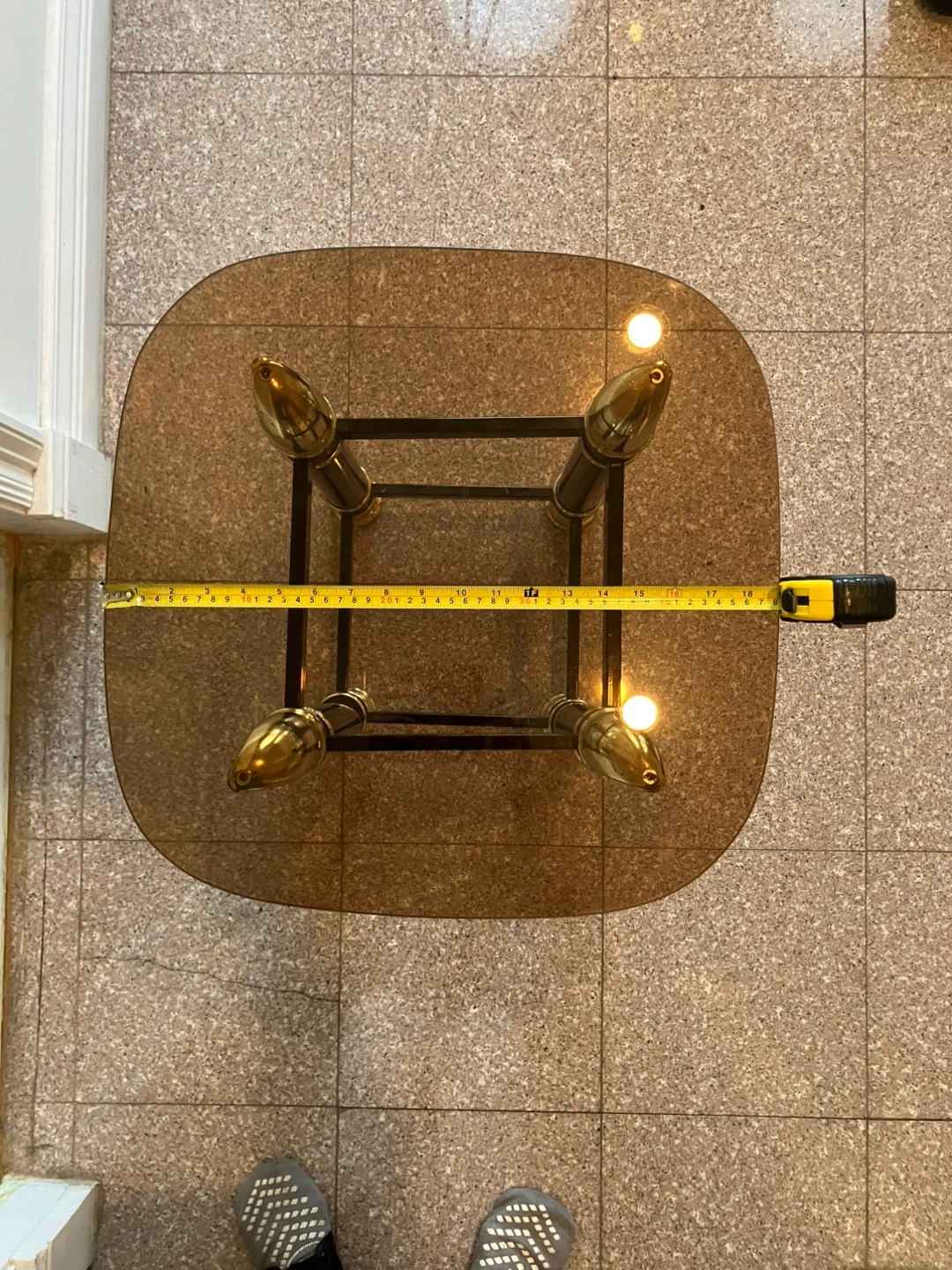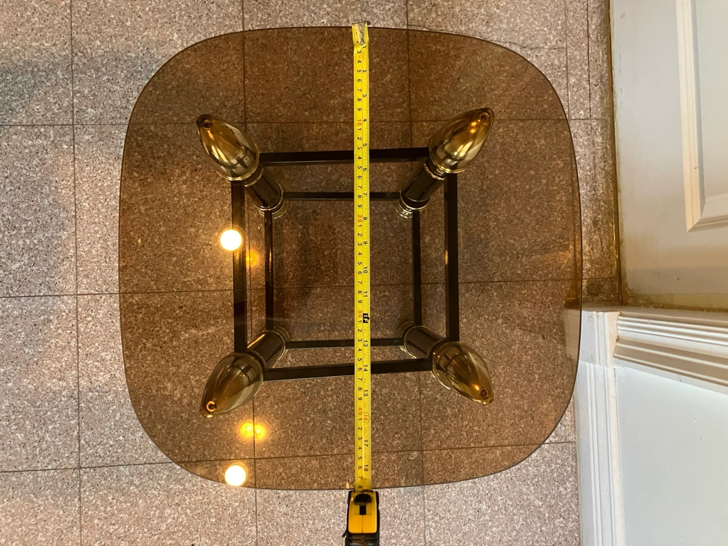 This stylish side table features a smoked glass top and a black base with striking gold accents. The frame is made of metal and wood. It's roughly 17 inches wide and 17 inches deep. The height is approximately 20 inches.