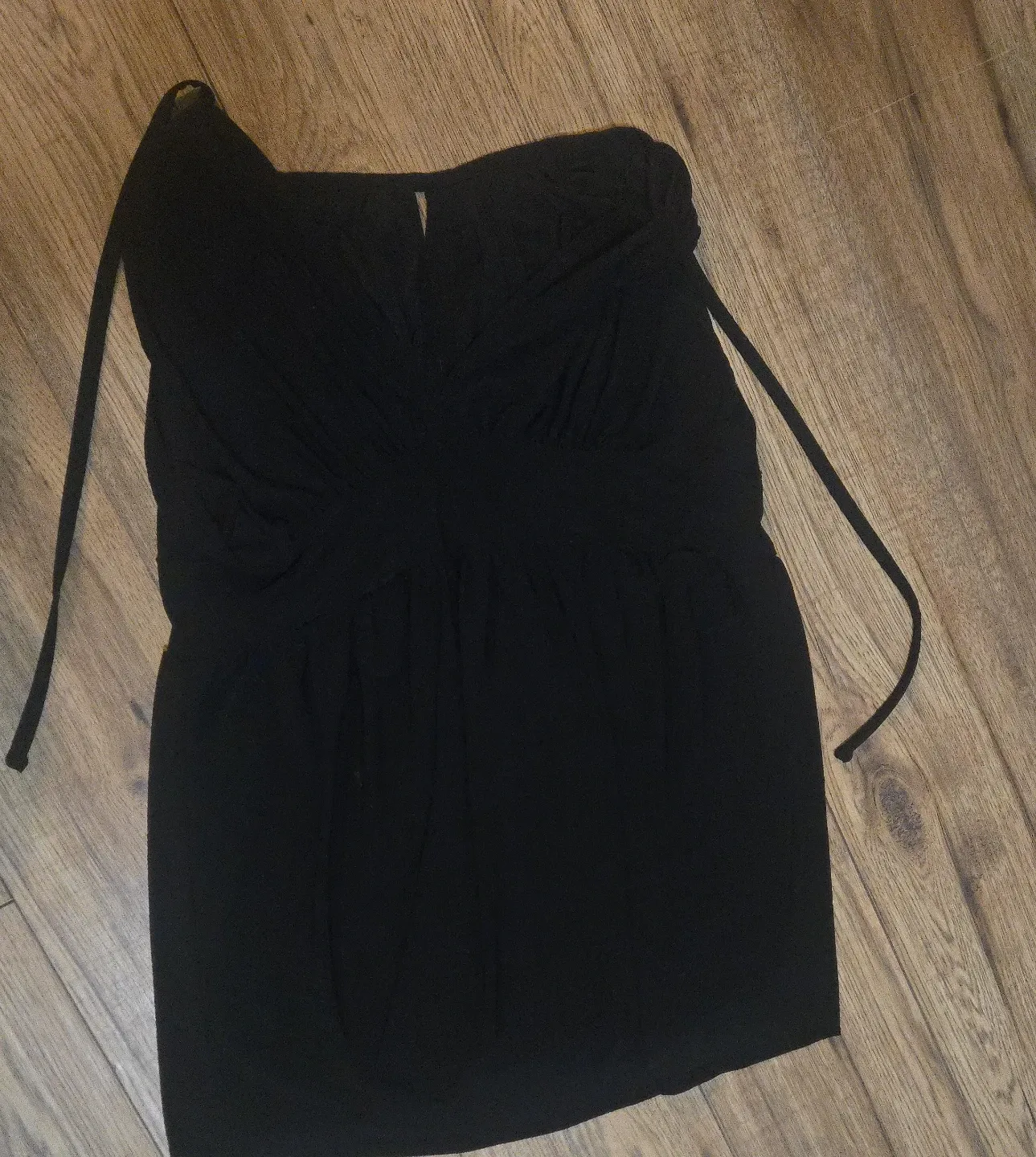 This strapless top is a versatile black piece. It features a ruched bodice and adjustable tie straps for a custom fit. The fabric is lightweight and flowy. Great for dressing up or down!