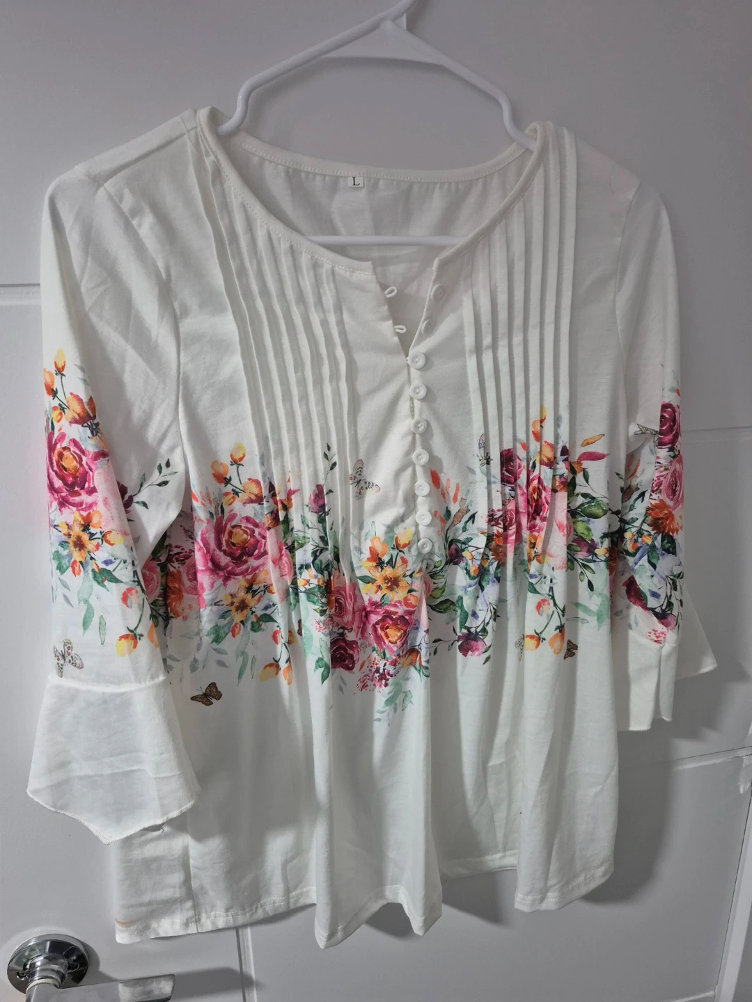 Here's a lovely floral print blouse in size L! The white fabric is adorned with a beautiful floral pattern, perfect for adding a touch of spring to your wardrobe. It features a button-up front and 3/4 sleeves.