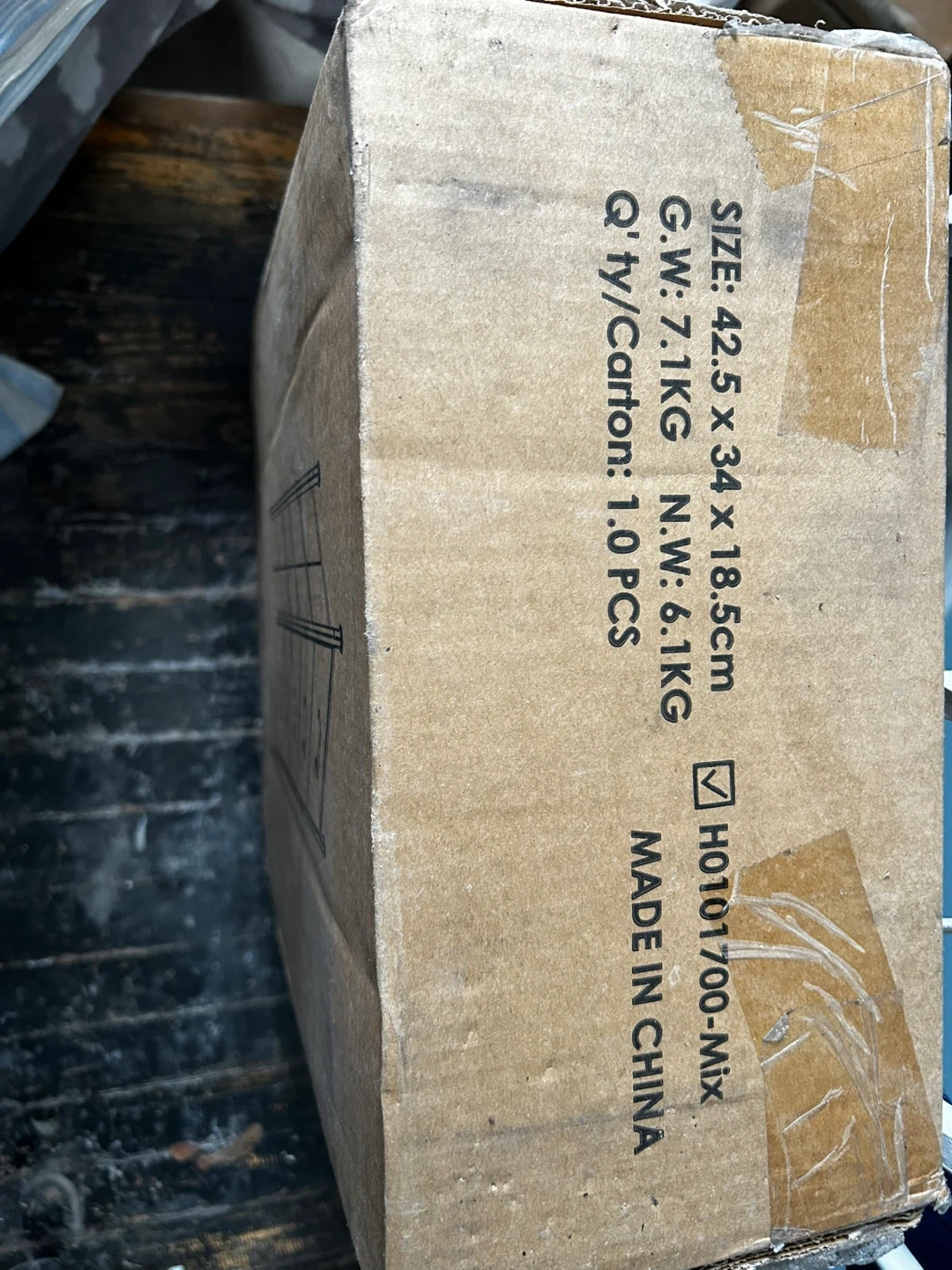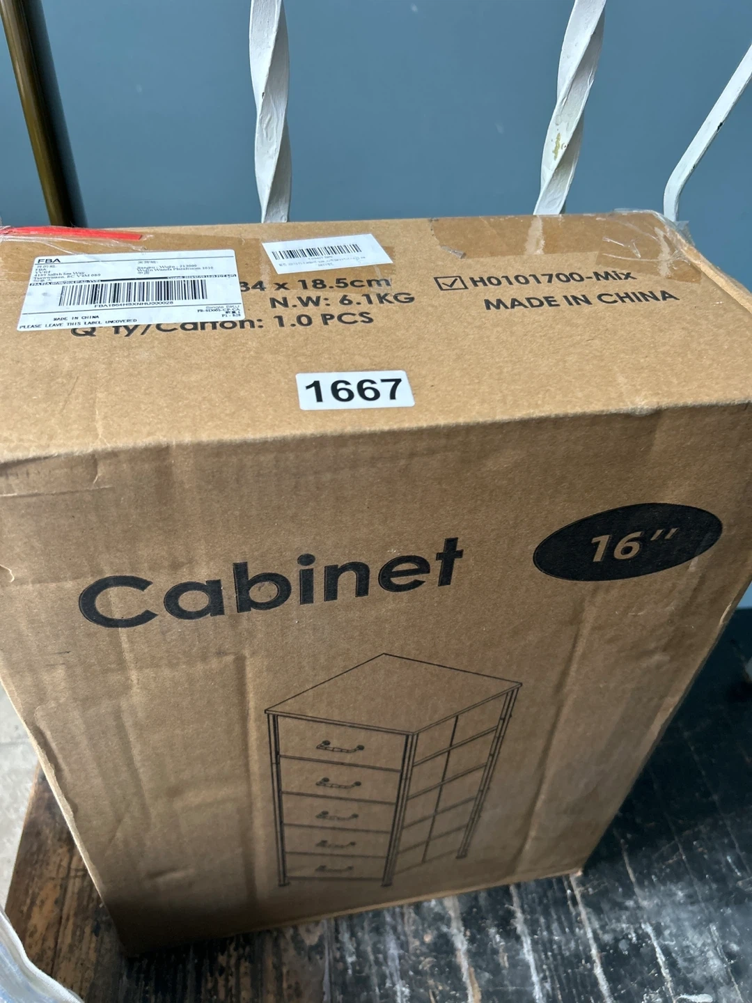 Fabric drawer cabinet with five drawers. It's a compact storage solution, great for organizing smaller spaces.