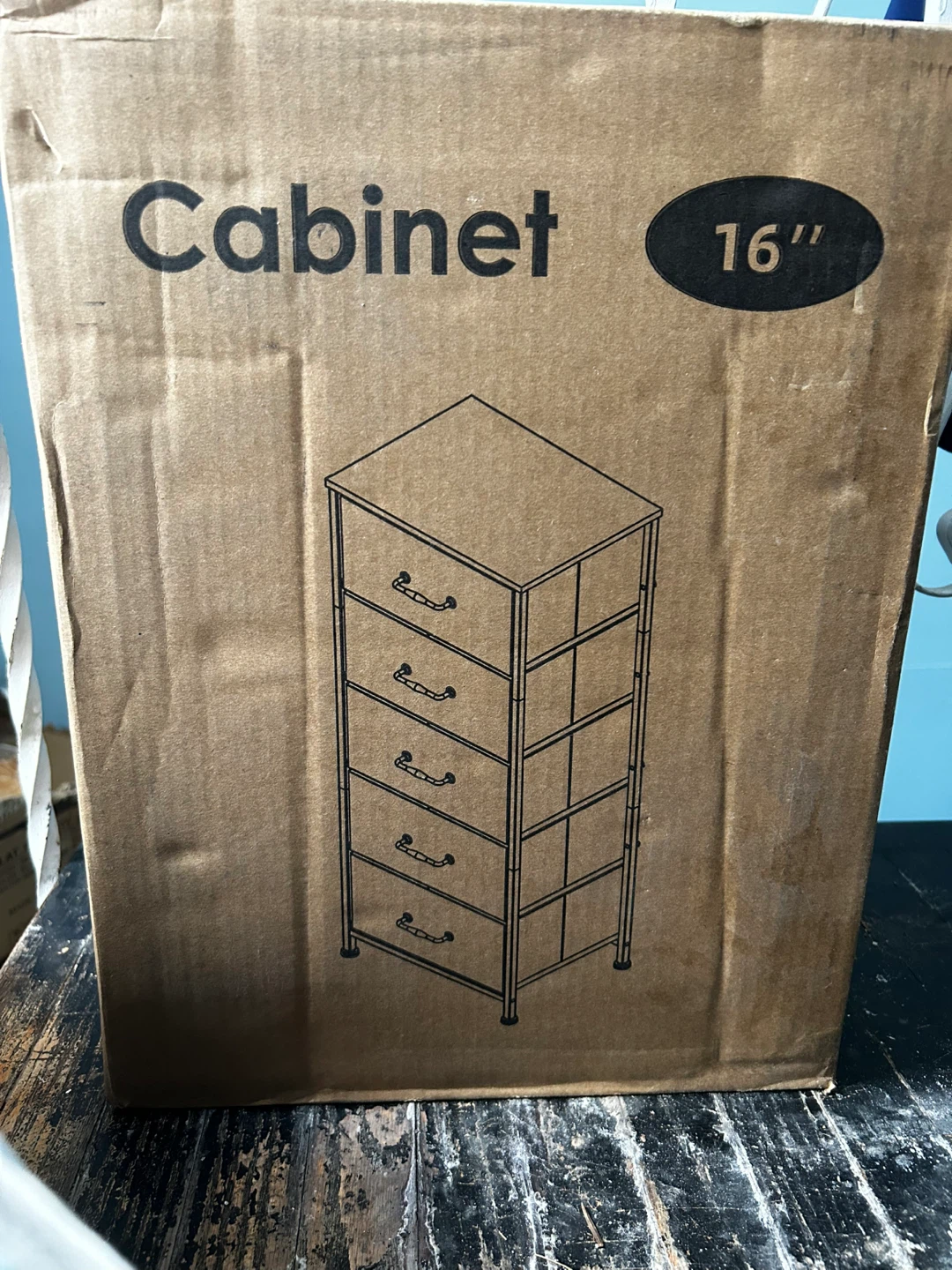 Fabric drawer cabinet with five drawers. It's a compact storage solution, great for organizing smaller spaces.