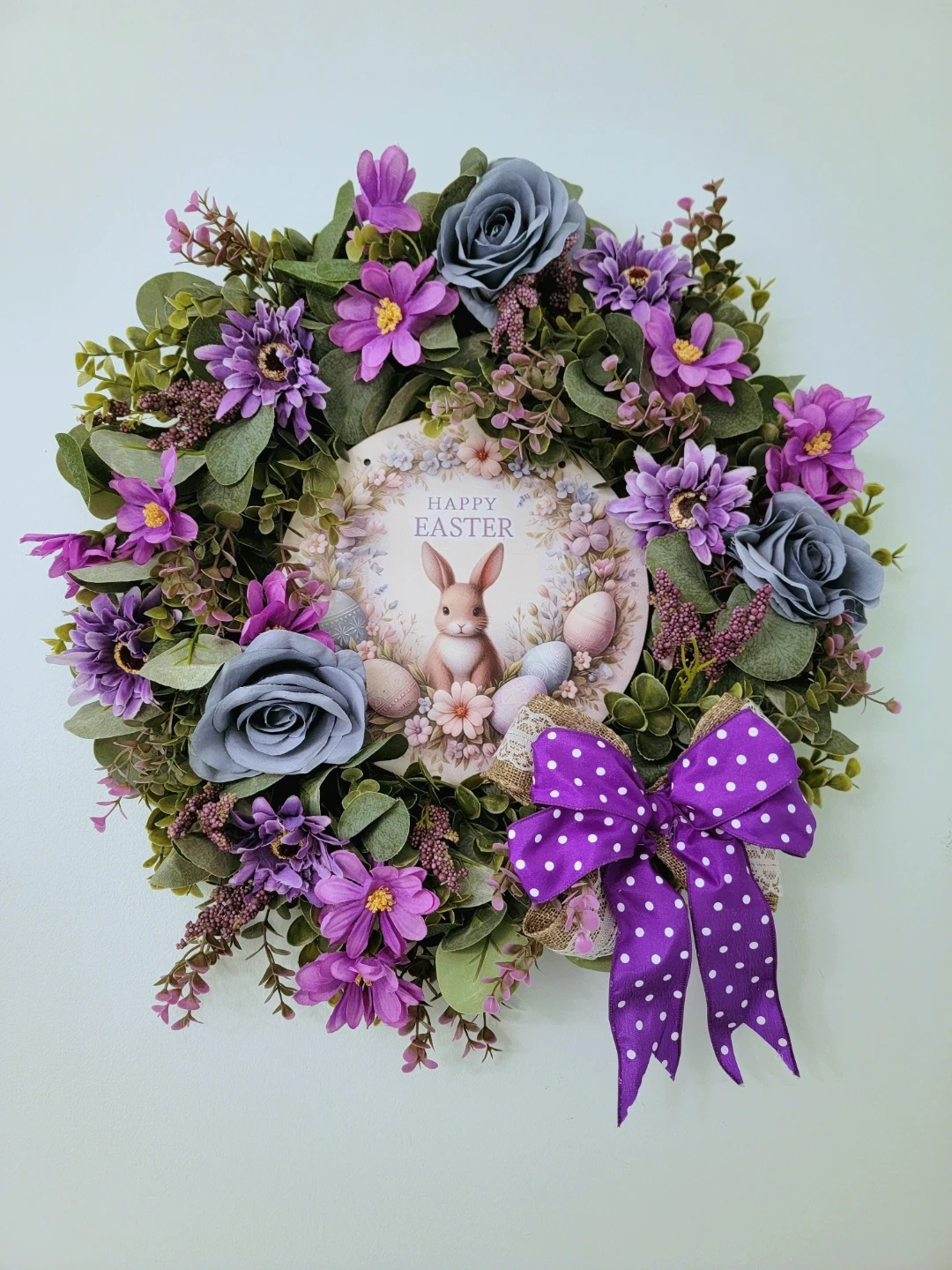 A festive Easter wreath adorned with purple and blue flowers, greenery, and decorative eggs. It features a central plaque with a bunny illustration and the 'Happy Easter' greeting. A large purple polka dot bow completes the design. This wreath is perfect for welcoming guests and adding a cheerful touch to your home during the spring season!