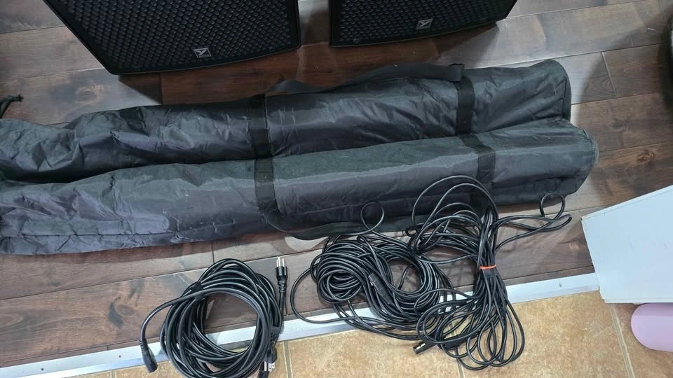 Long XLR and power cables included to connect the system.