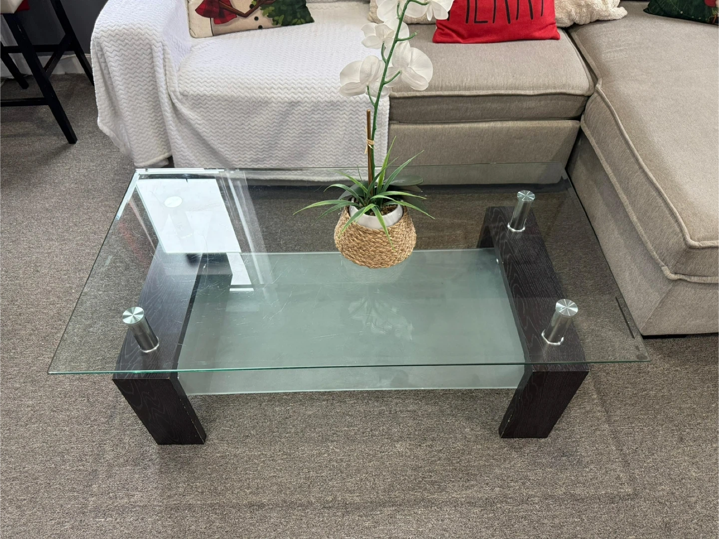 This coffee table features a clear glass top and a frosted glass shelf. It's supported by dark wood-look legs and silver-tone metal accents. The dimensions are approximately 42" L x 20" W x 16" H.