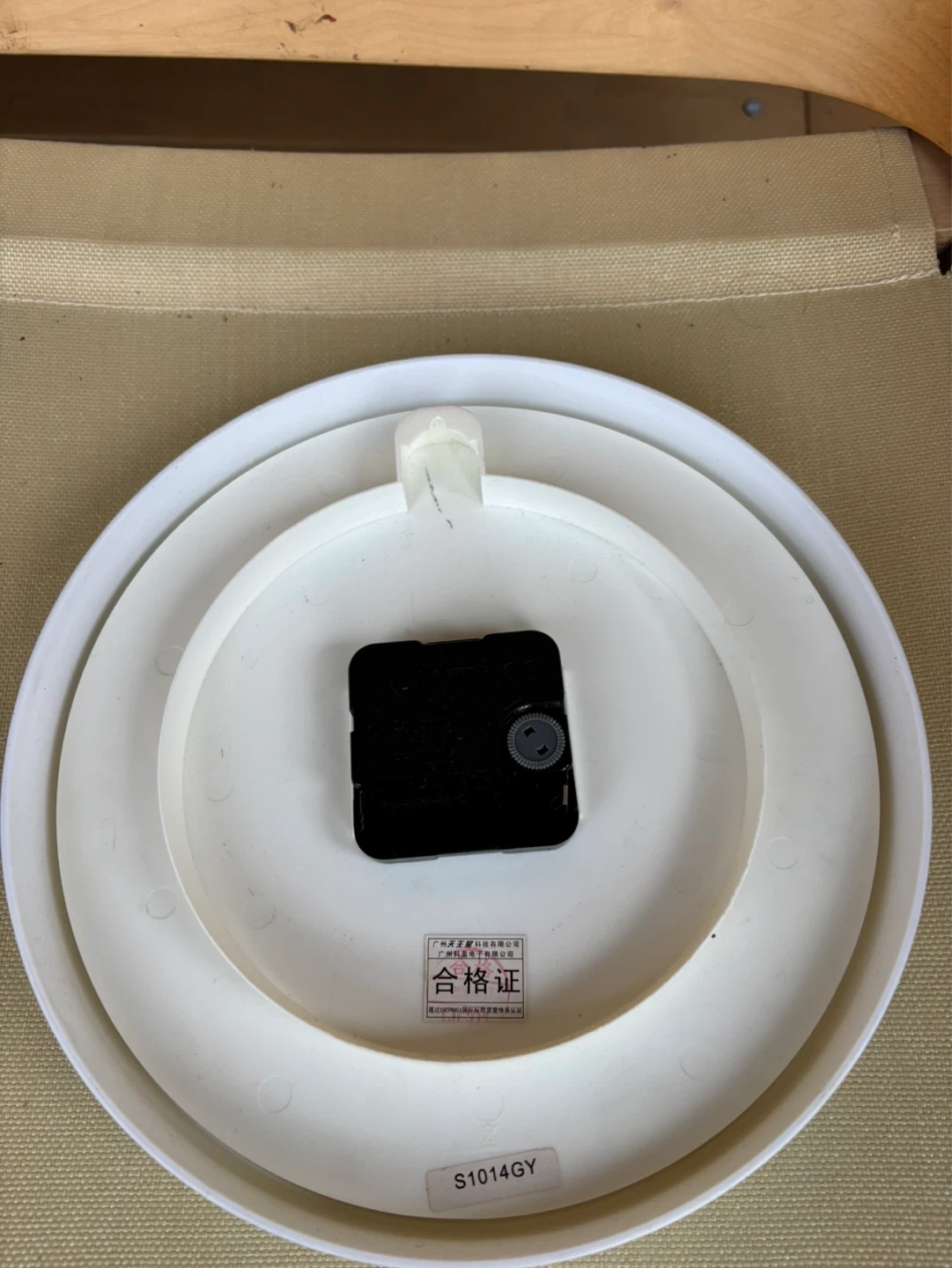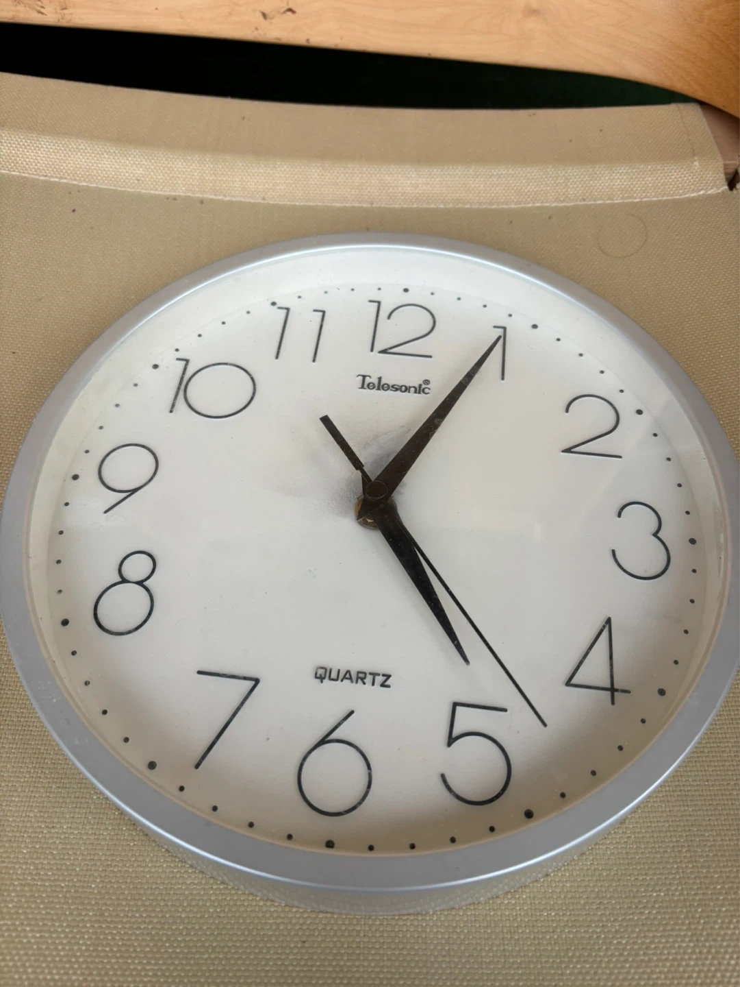 A simple Tolasonic quartz wall clock. White face with black numbers and silver-tone bezel. It's a standard size for most rooms. Needs one AA battery, not included.