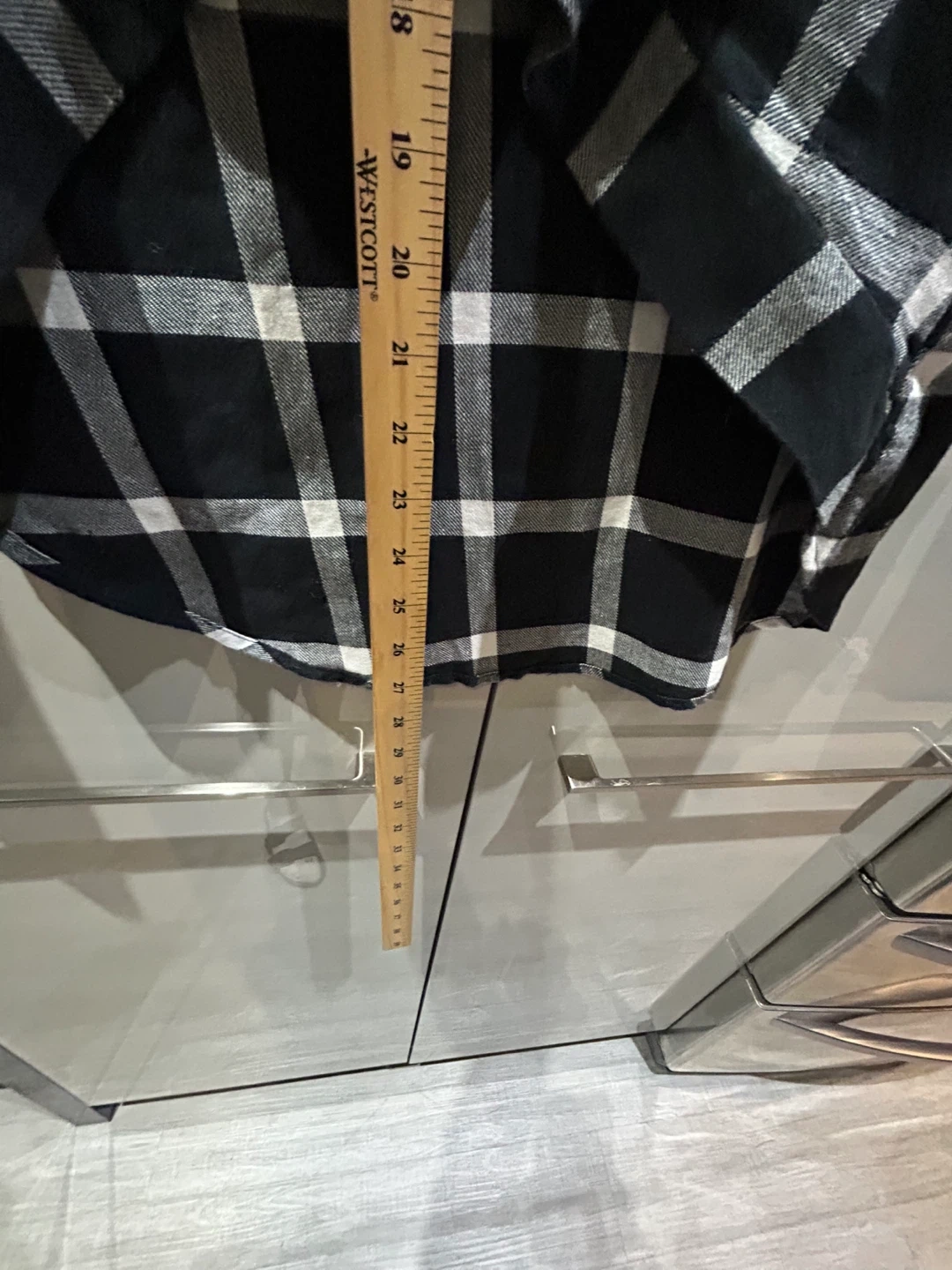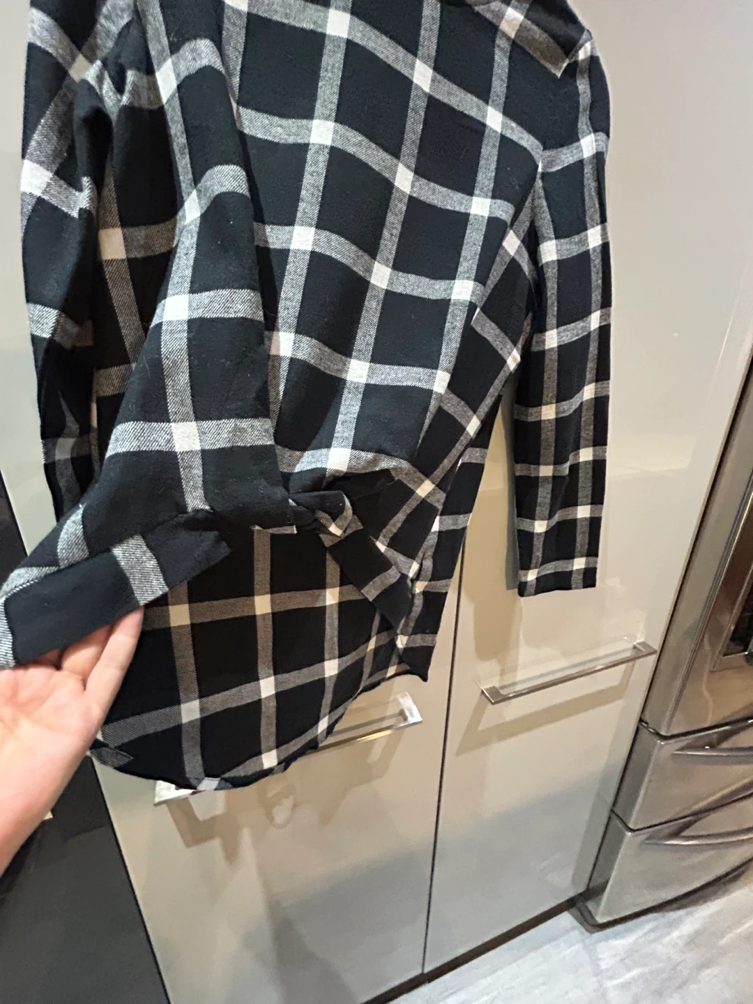 Here's a black and white flannel plaid long sleeve shirt. It has a unique tie detail at the front. The length of the shirt is approximately 27 inches.