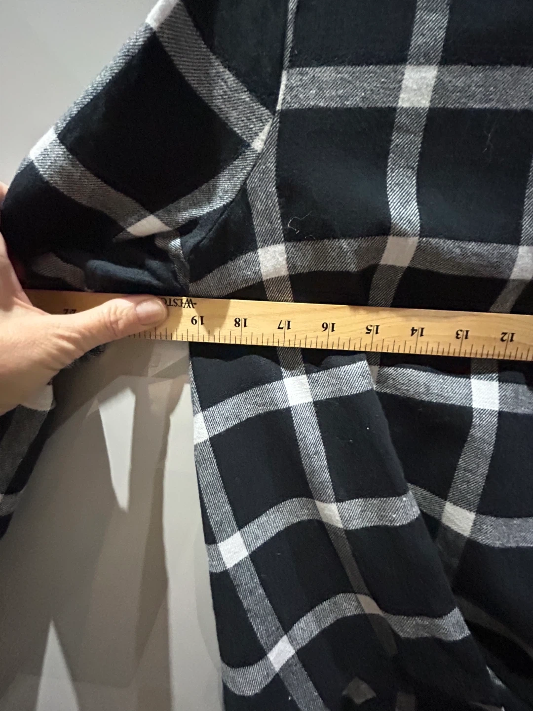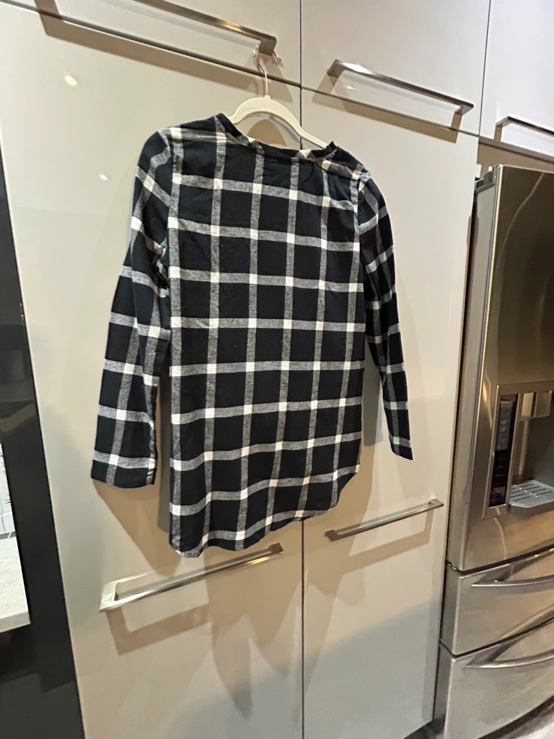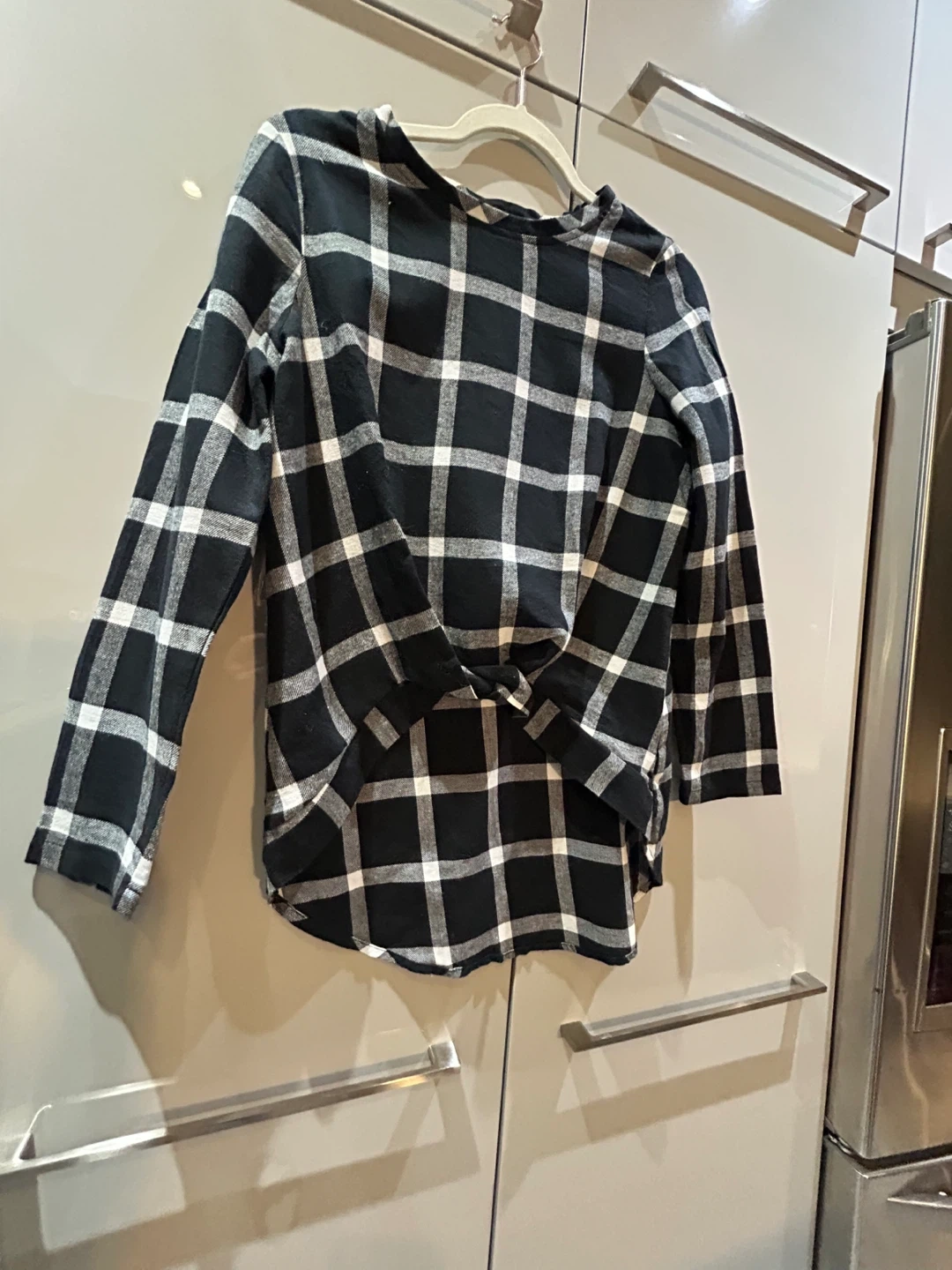 Here's a black and white flannel plaid long sleeve shirt. It has a unique tie detail at the front. The length of the shirt is approximately 27 inches.