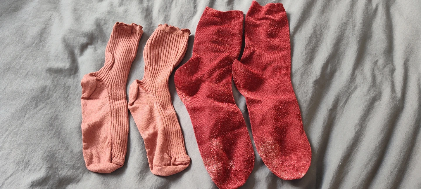 Two pairs of crew socks are included. One pair is a dusty pink with a ruffled cuff and ribbed texture. The other pair is a sparkly red.