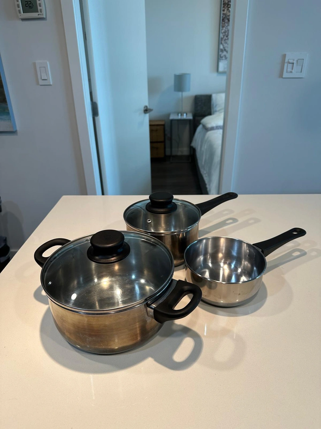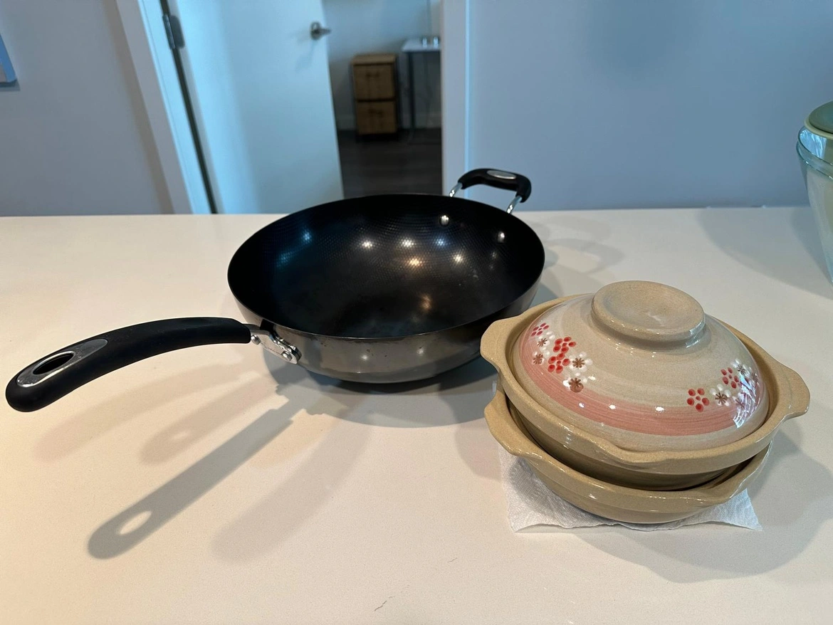 Set of cookware, includes pots, pans, and a wok. Good for a small kitchen or for a student.