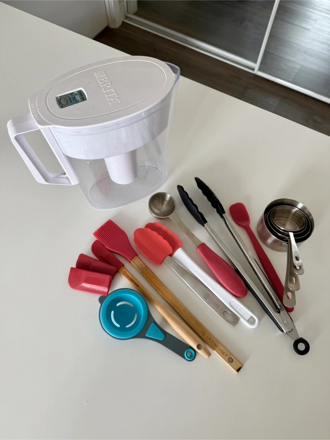 Brita water filter pitcher and a set of assorted kitchen utensils. Includes silicone spoon and spatulas, a pastry brush, tongs, Starbucks 10g coffee measuring spoon, 4 measuring cups, an egg separator. Utensils are from brands like Le Creuset and Silicook, AMCO.