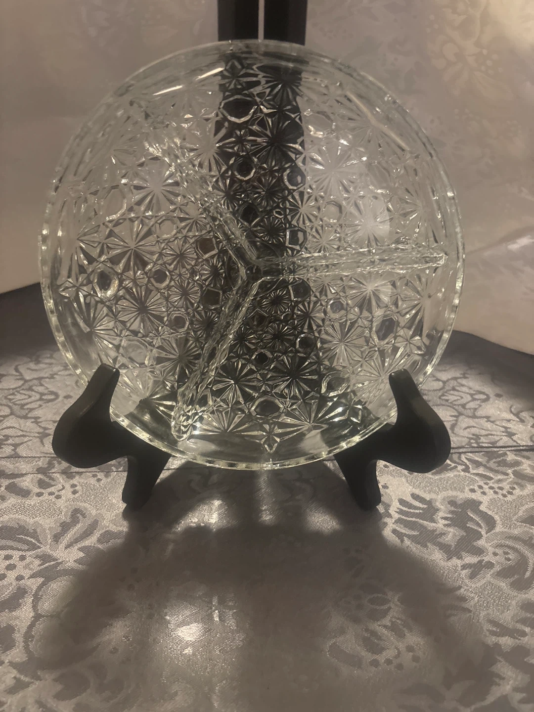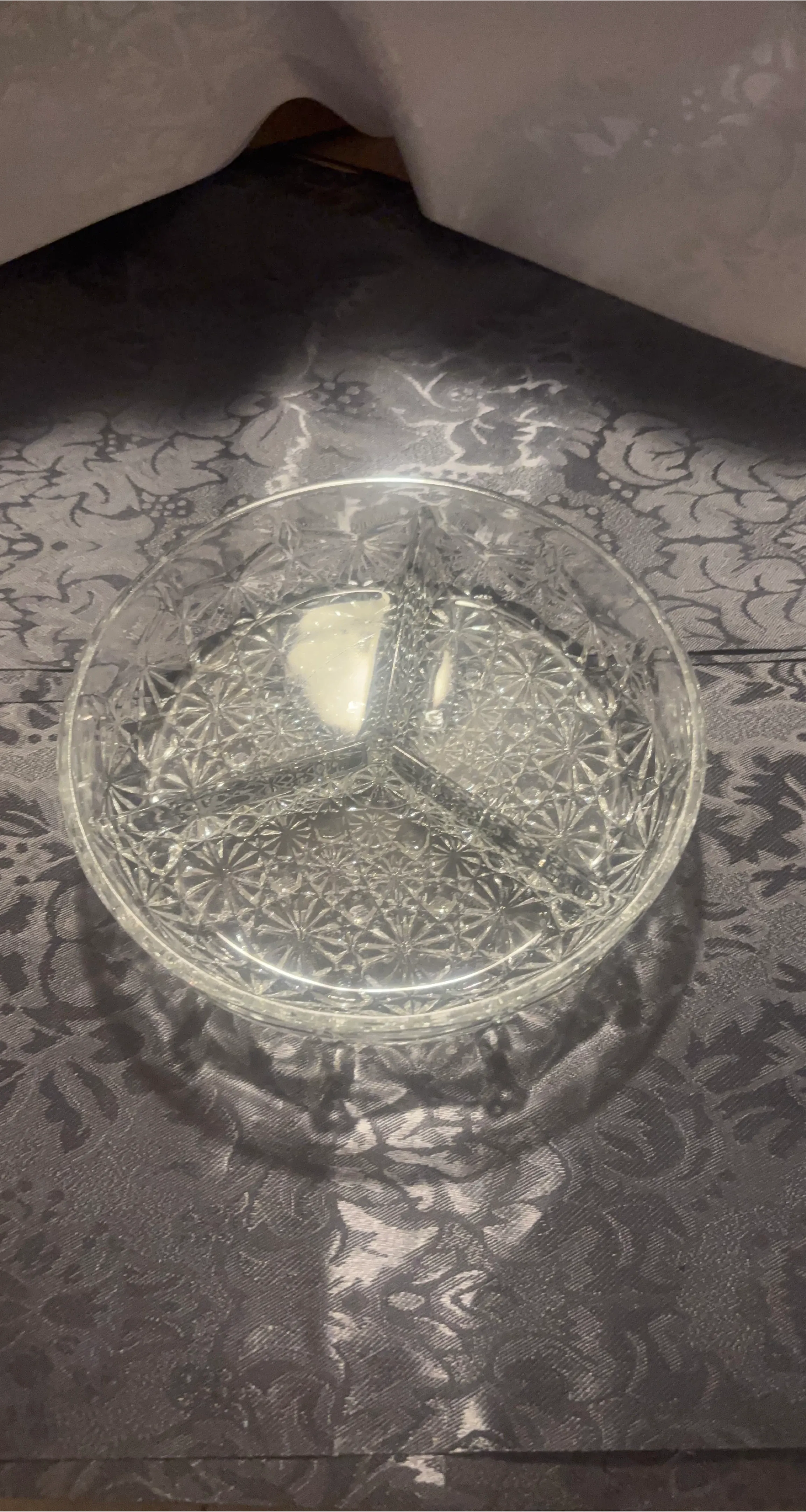This clear glass divided serving dish has a textured starburst pattern. It features three compartments for serving different snacks or appetizers. Dishwasher safe for easy cleanup!