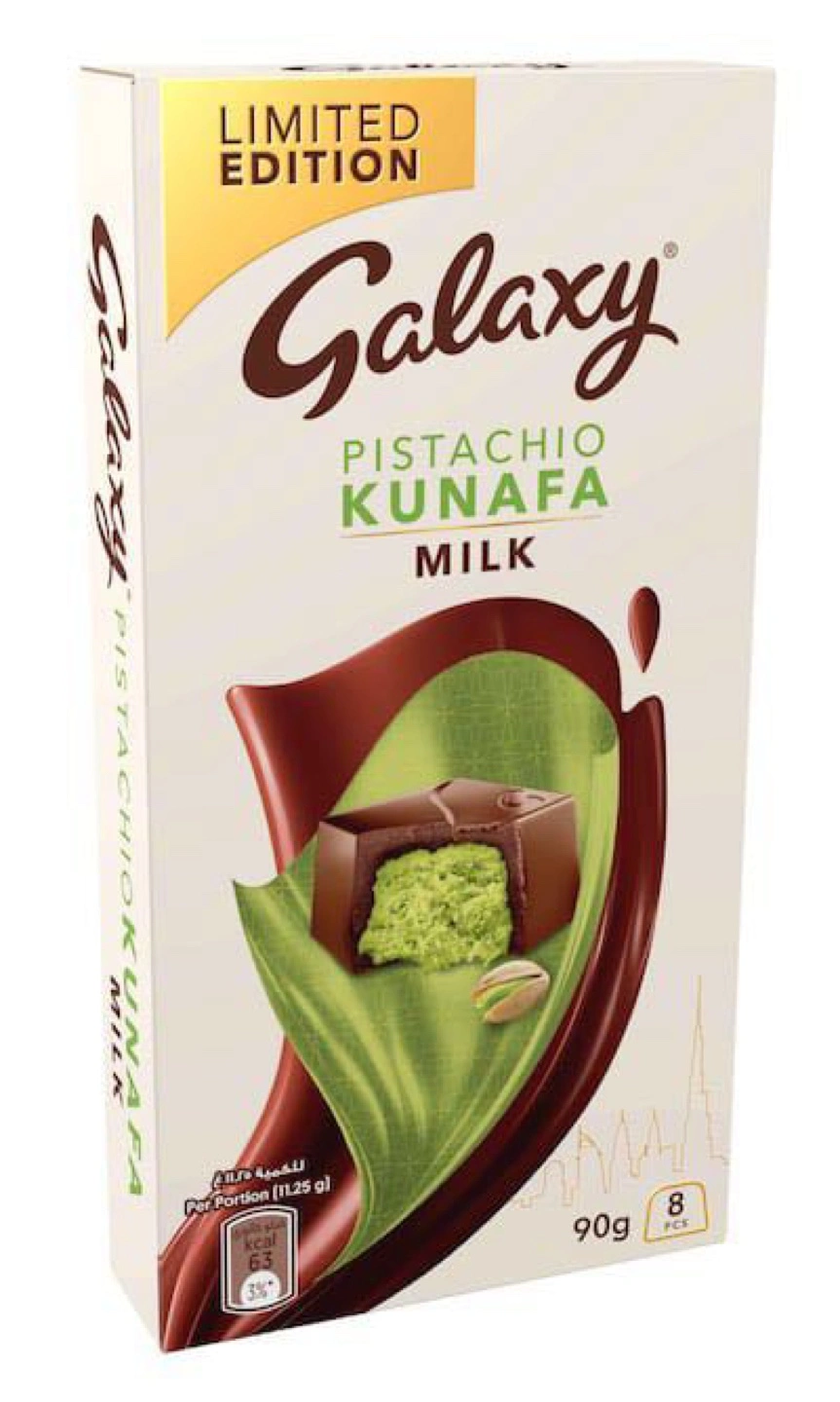 Enjoy the delightful taste of Galaxy chocolate filled with Kunafa! It features milk chocolate with Kunafa pieces and pistachio cream filling. Wrapped in pleasure!