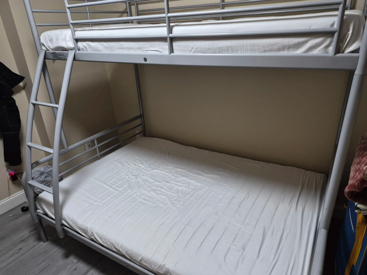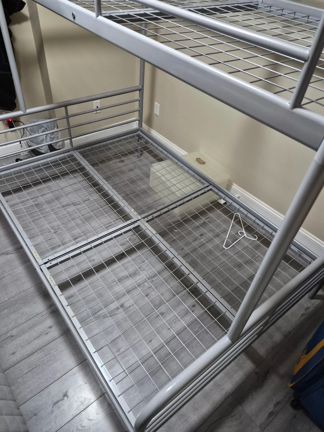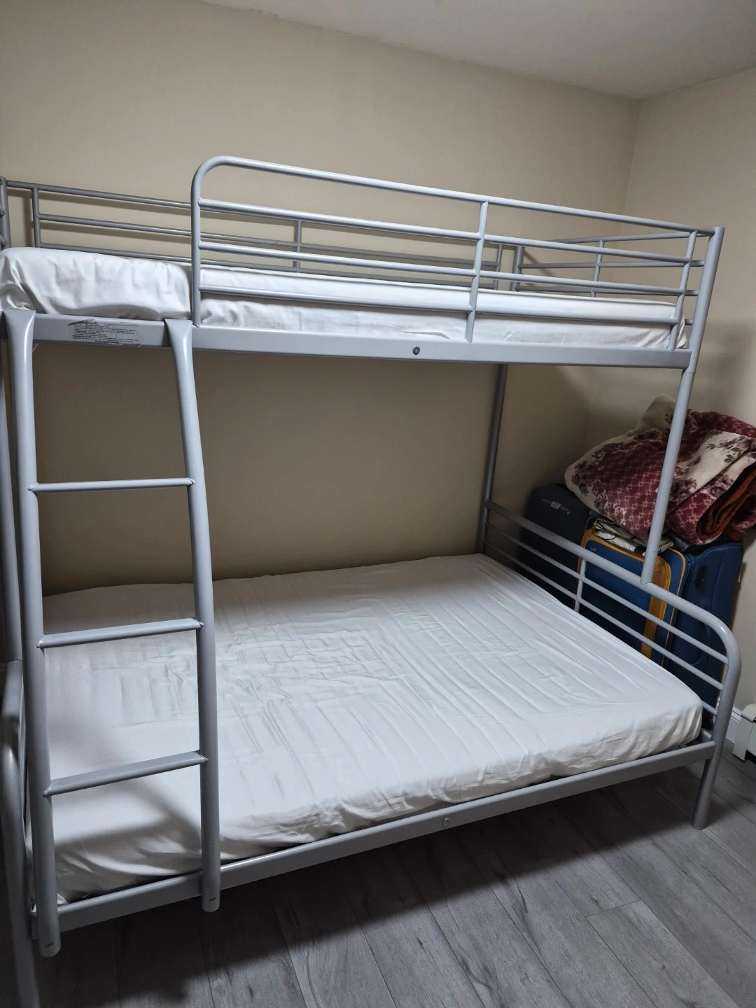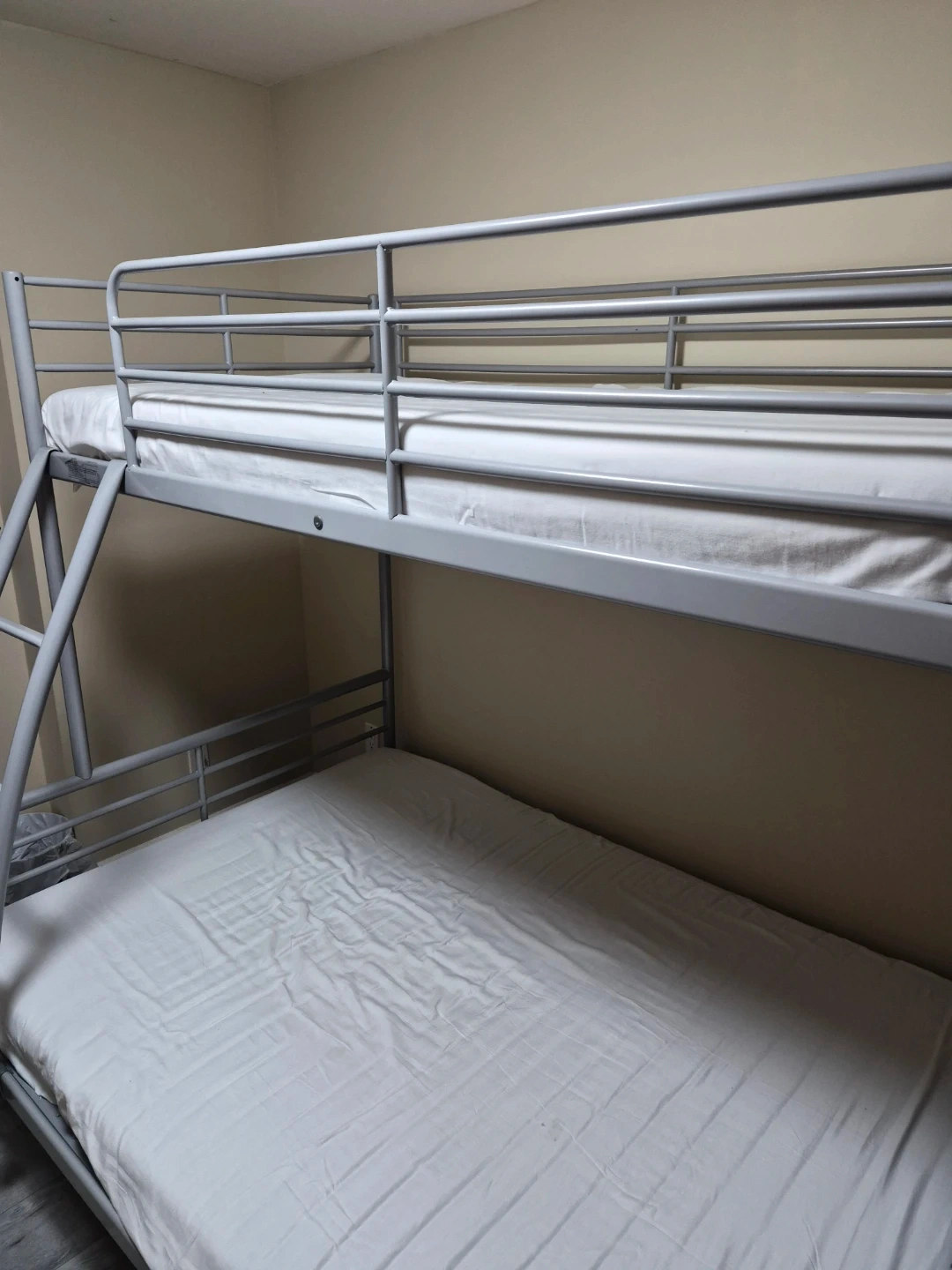 A sturdy silver metal bunk bed frame. Includes guard rails for the top bunk and a ladder for access. This bed is great for saving space in bedrooms.