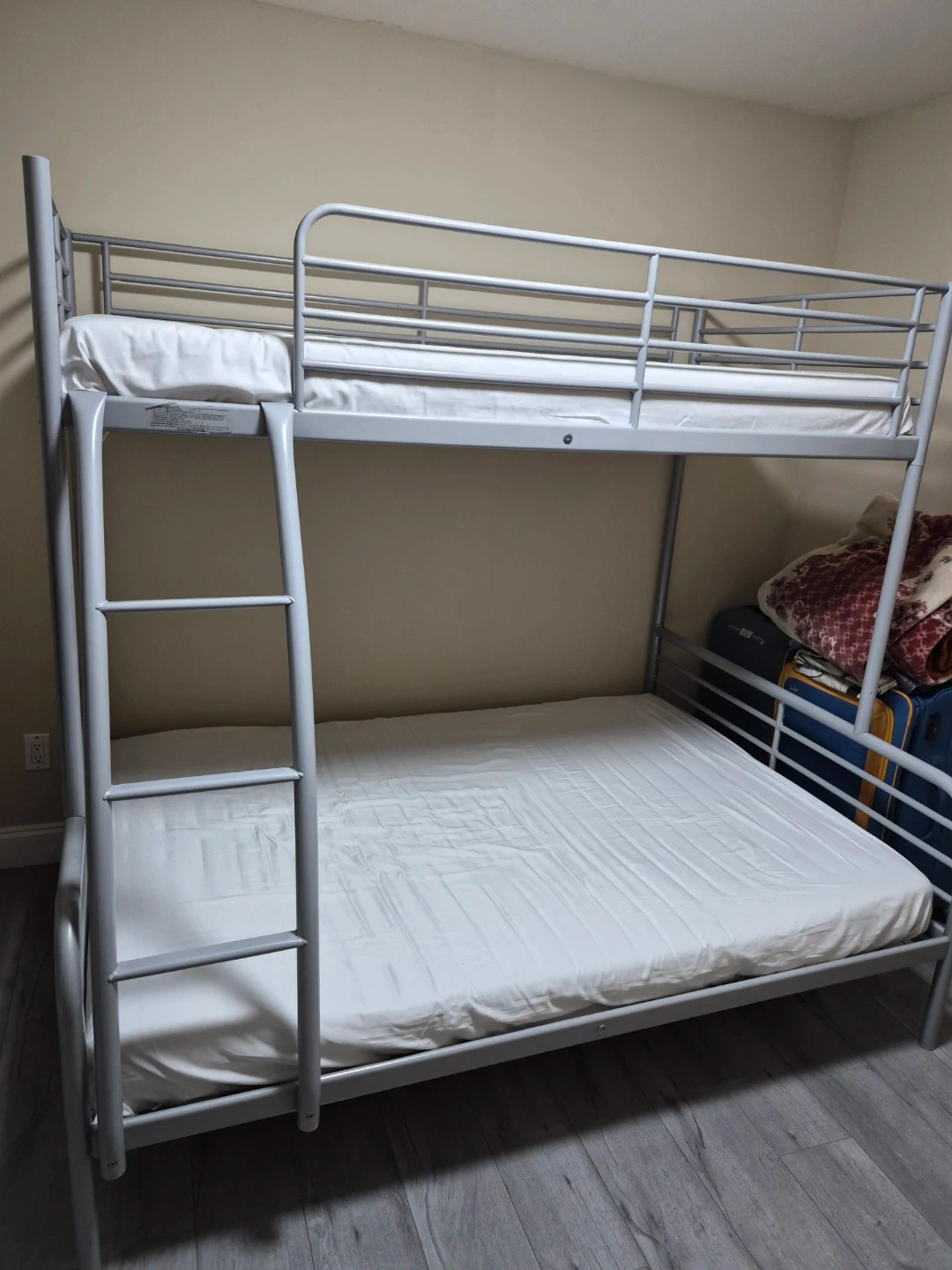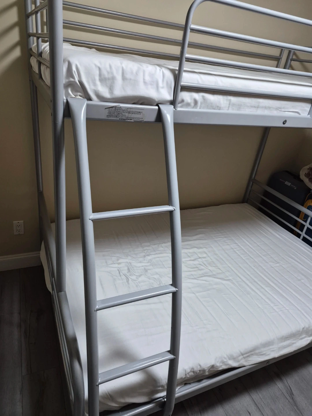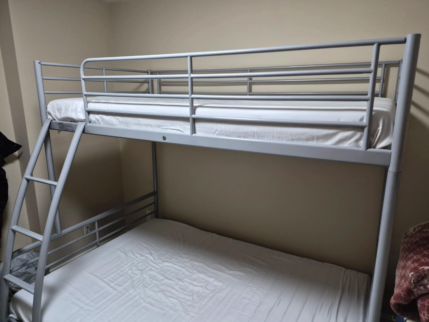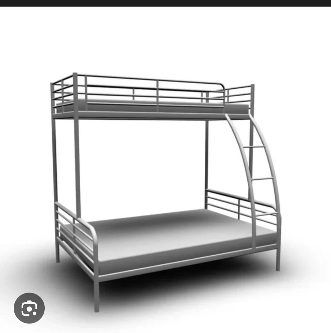 A sturdy silver metal bunk bed frame. Includes guard rails for the top bunk and a ladder for access. This bed is great for saving space in bedrooms.