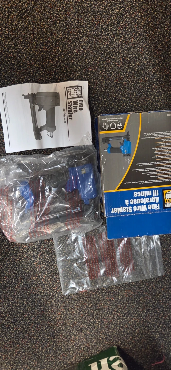 This is a Power Fist fine wire stapler, perfect for upholstery, cabinets, and crafting. It has a 100 pc fastener capacity and operates between 60 to 100 PSI. This tool uses T-50 staples and all generic 1/4 in. to 5/16 in. staples.